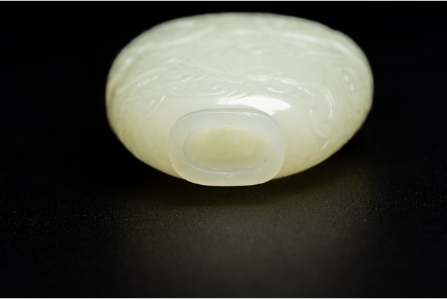 圓口,短頸,鼓腹下收,圈足,器型小巧可愛。本器上等和田白玉製成,玉質潔白細膩,瑩潤光潔。 ,蓋鈕為碧玉製成,器身滿雕飾“雲蝠紋”,蝙蝠翱翔於雲間,姿態各異,祥雲迤邐,寓意千雲祥集,洪福紛至。佈局疏朗清新,生動流暢