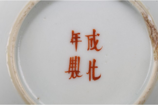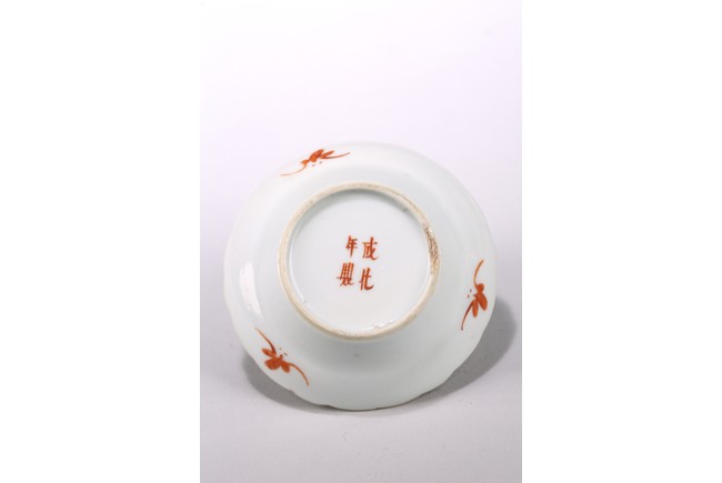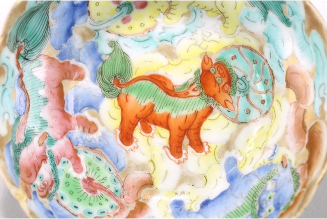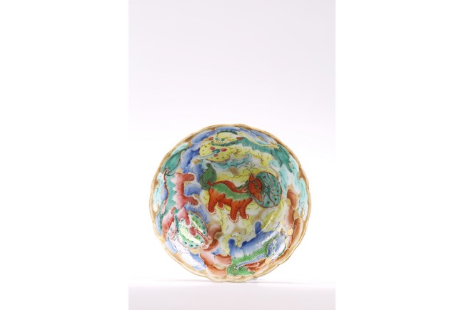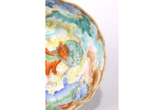 The small dish painted to the interior with multiple buddhist lion playing with brocade ball, base inscribed with apocryphal chenghua mark. 19th century, Qing Dynasty period.