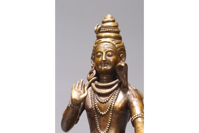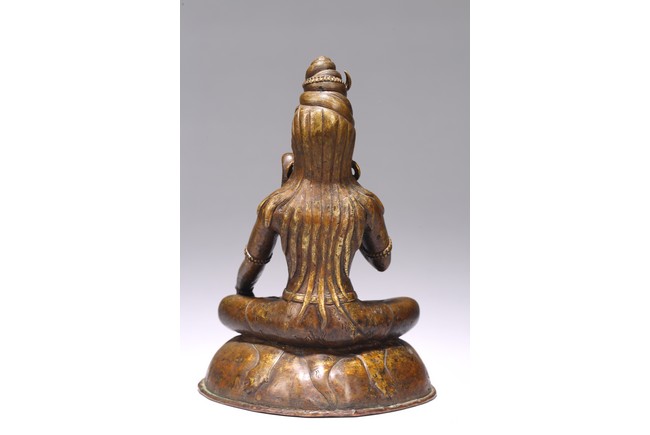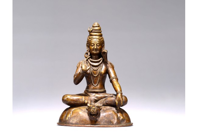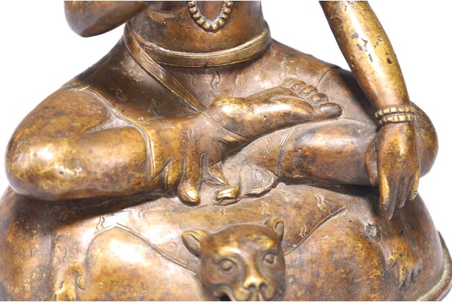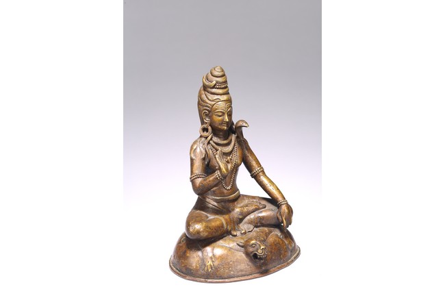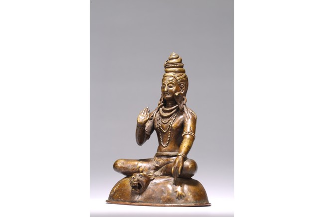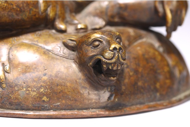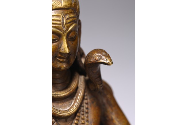 The deity seated above an animal skin covered plinth, right hand raised with palm facing forward, her neck surrounded by a snake, her face with serene expression. 19th century.