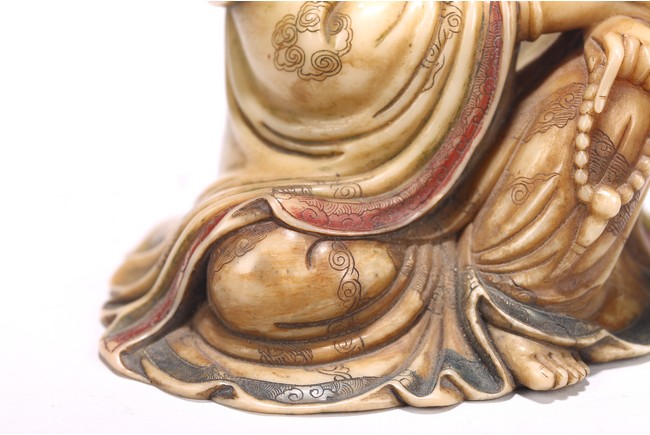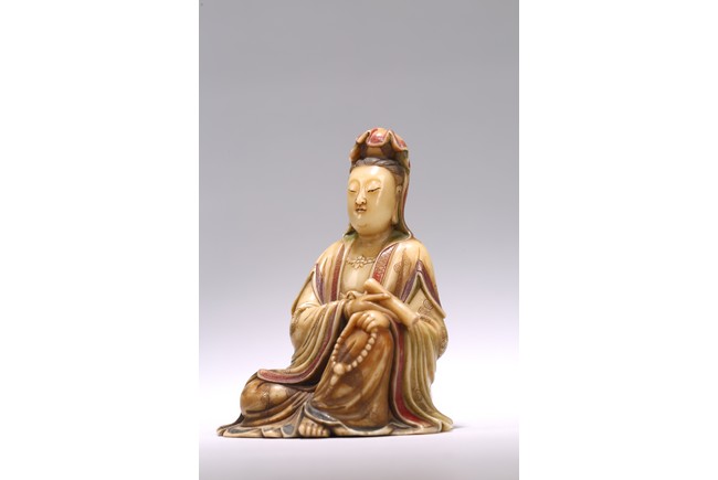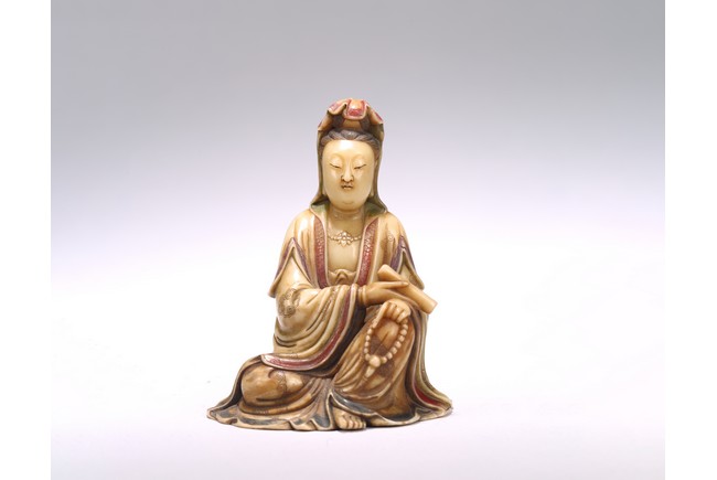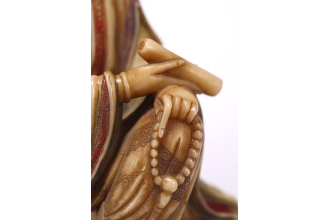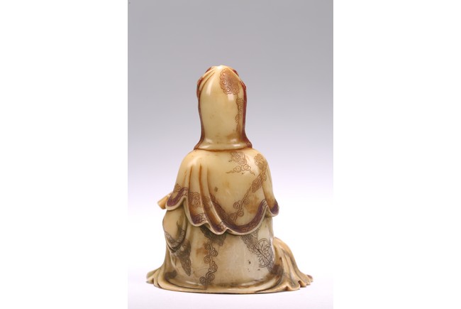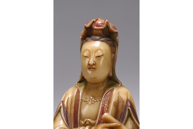 The figure with her robe gathered gracefully around the body, the soft oval face carved with delicate features and the hair drawn up into a coiled topknot secured under veil, the incised decoration highlighted with red and green pigments. Qing Dynasty period, 18th century.