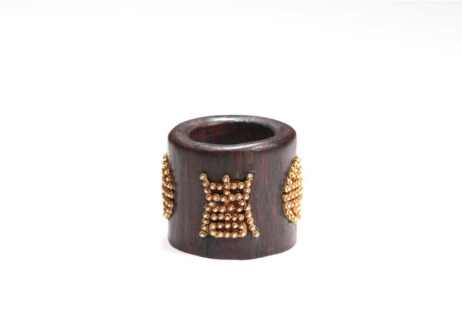 The agarwood carved ring is inlaid in tiny gold beads with stylized character and auspicious symbols. Qing Dynasty period.