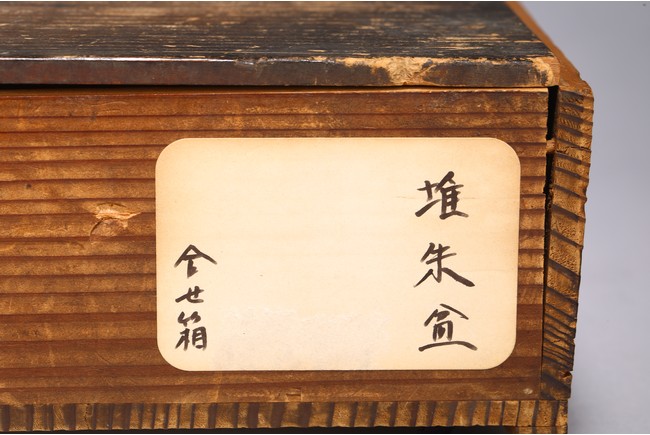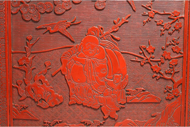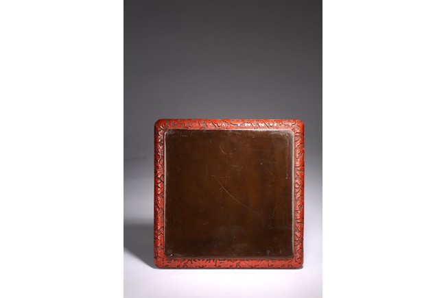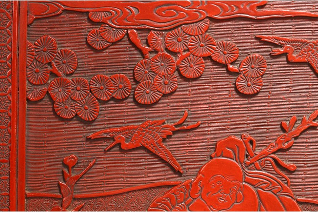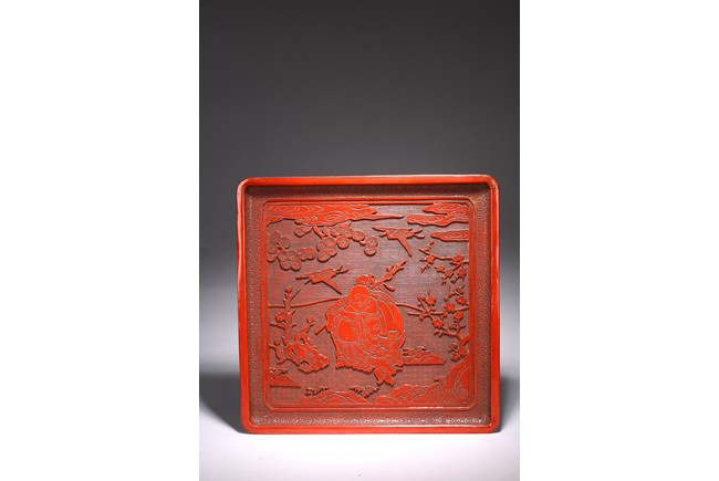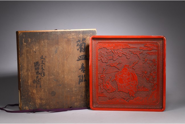 Of square form, the interior finely carved through the red lacquer to depict the budai accompanied by two boys in a garden setting, the underside decorated with floral decorations, the base lacquered dark brown. Accompanied with original Japanese wooden box. 19th century.