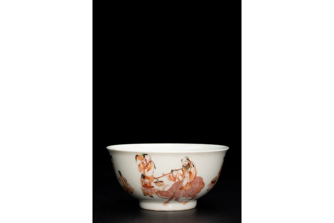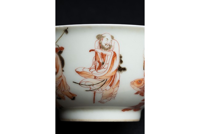 Painted around the exterior in iron red with various immortals, the hair enameled in black, the base inscribed with apocryphal Ming reign mark.