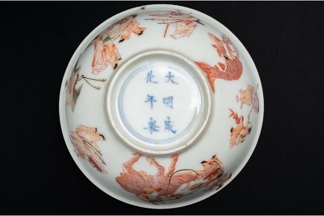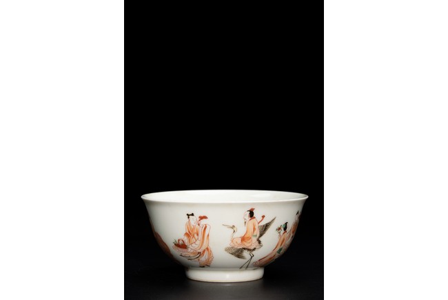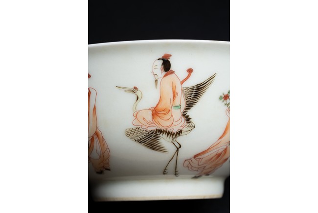 圓口,深腹,直圈足。胎質潔白細膩,釉汁溫潤透亮。外壁繪“八仙人物紋”,人物神情各異,形像生動,繪工極為精湛,構圖嚴謹,佈局合理。 “大明成化年制款識”,為寄託款。