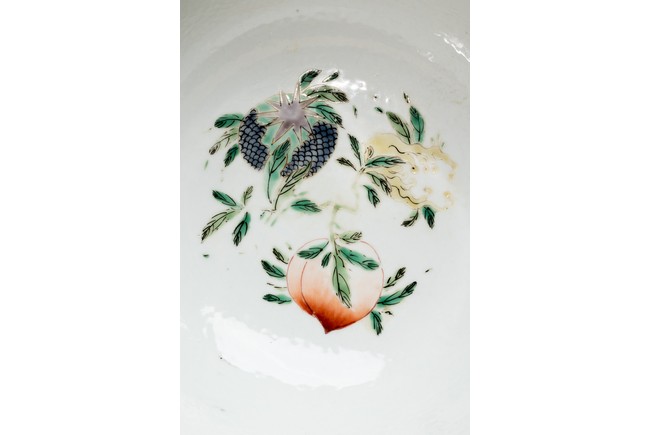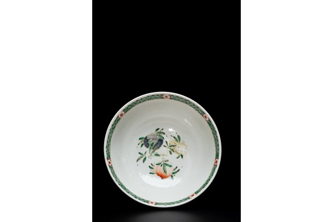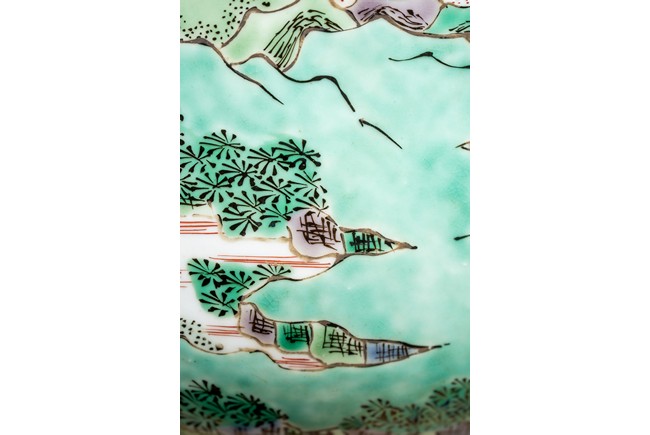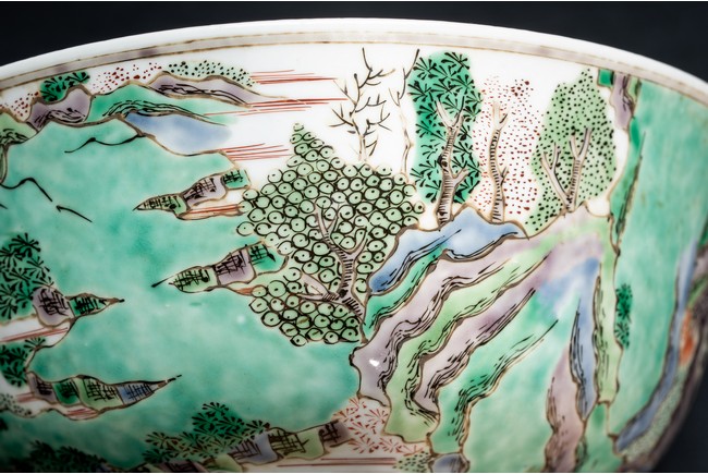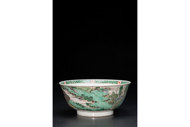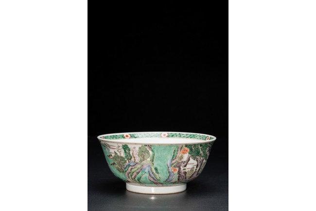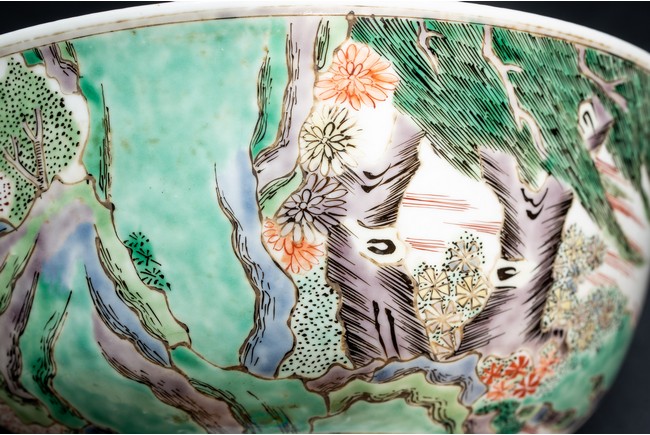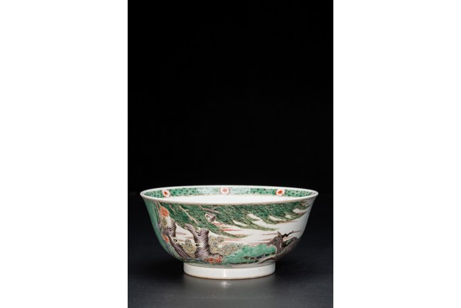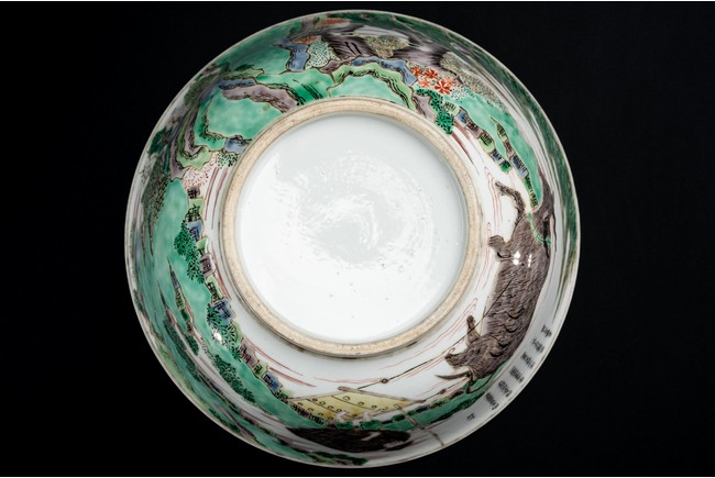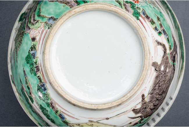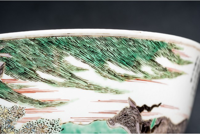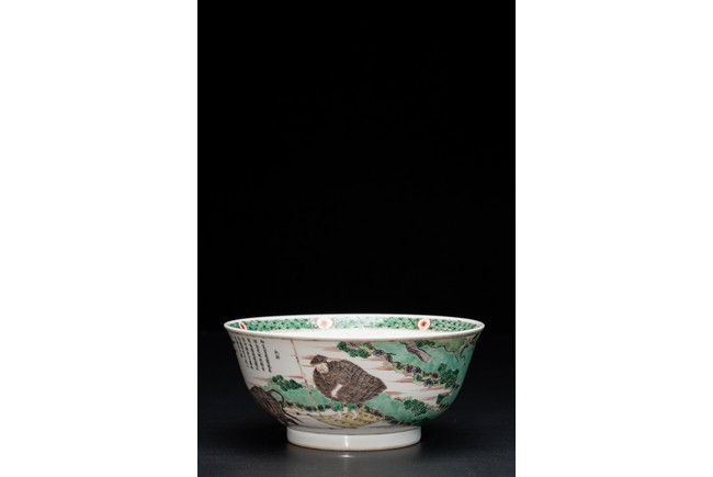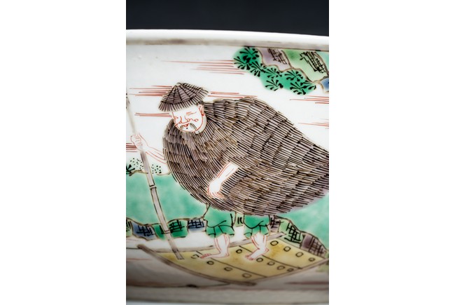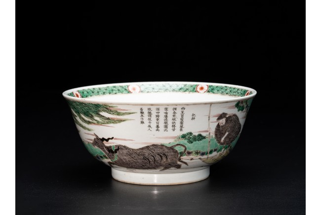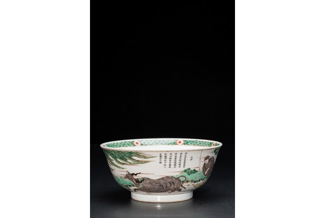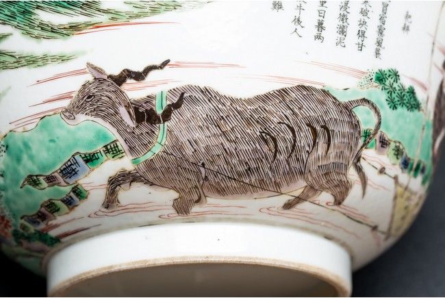 形制規整,碗體頗大,圓口,深腹,圈足。胎質細膩溫潤,釉汁肥厚。外壁五彩繪“漁人” “山石”“牧牛”“花草”等。構圖嚴謹,分佈均勻,人物神情生動,柳樹隨風飄揚,牧牛立於水面之上,好一副安詳美好的畫面。墨彩書“雨笠冒宿霧,風蓑擁春寒。破塊得甘霔,齧塍浸微瀾。泥深四蹄重,日暮兩股酸。謂彼牛後人,著鞭無作難