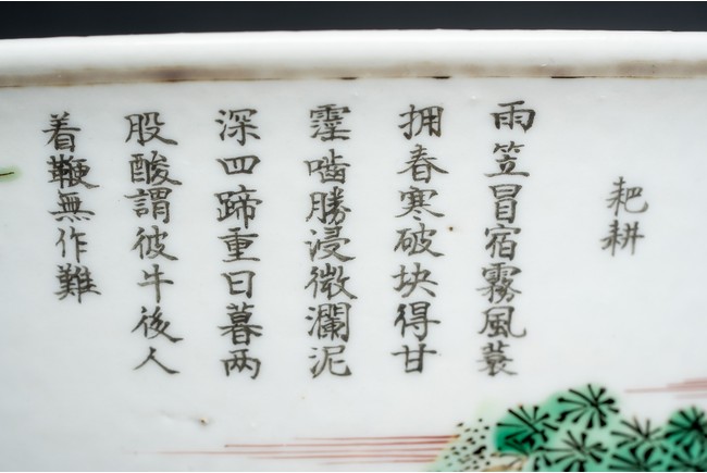 The rounded sides painted in tones of green, yellow and aubergine, depicting a landscape scene with rocks and trees, the reverse decorated with a elderly farmer and his buffalo, further inscribed with a poem matching the subject. Qing Dynasty period.
