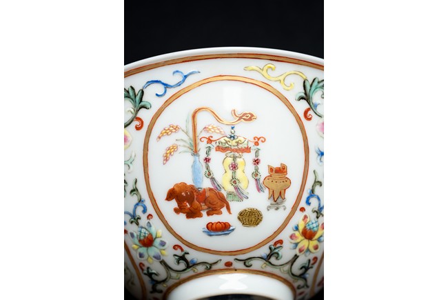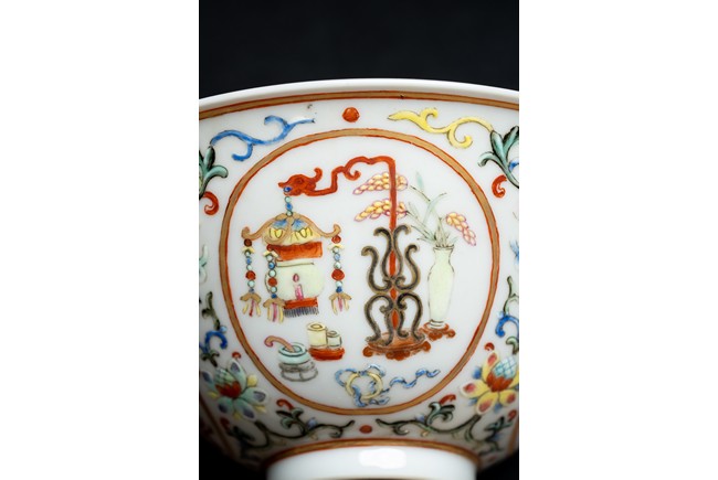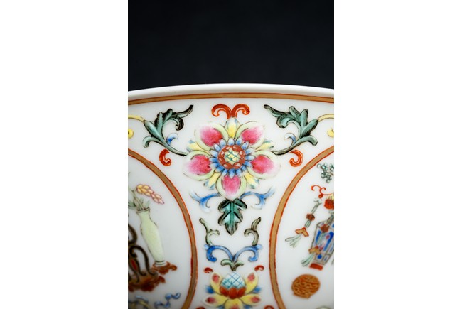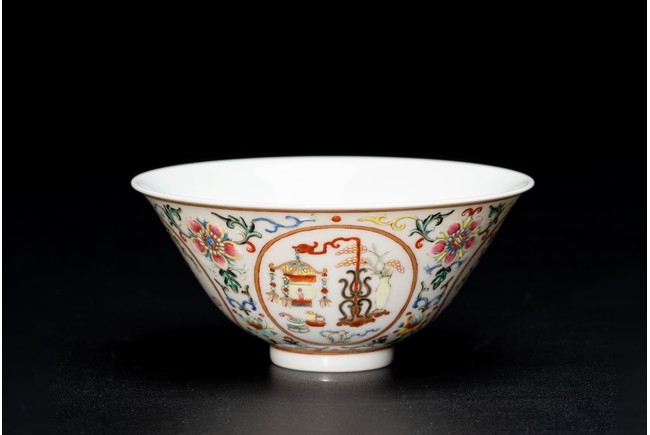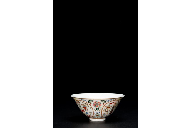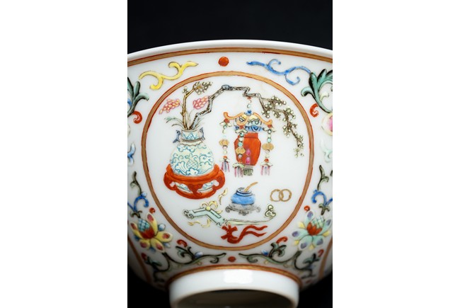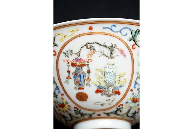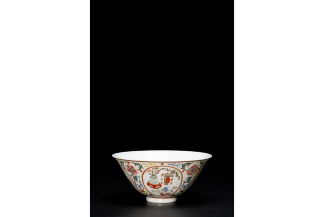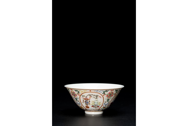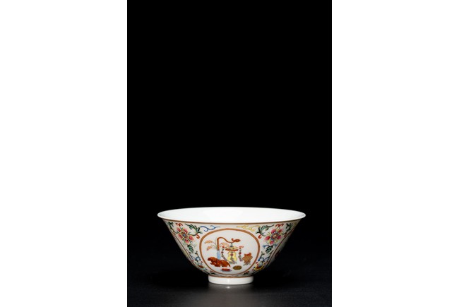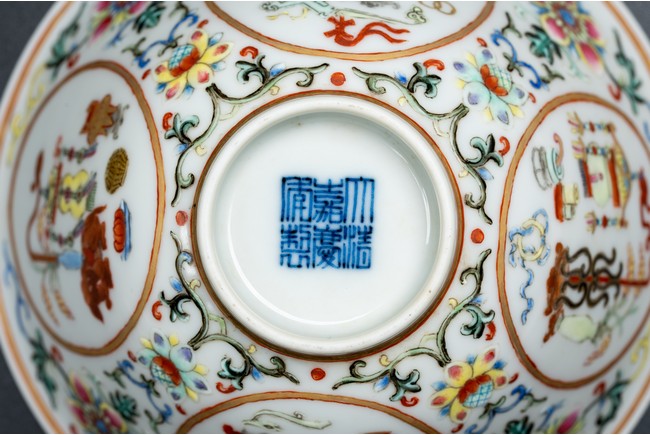 The bowl exterior decorated with medallions enclosing various vases and treasure objects, separated by stylised floral sprays, base inscribed with reign mark.