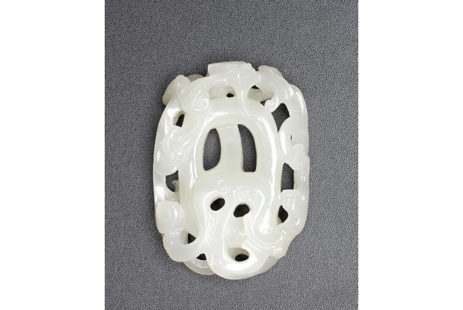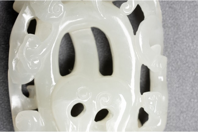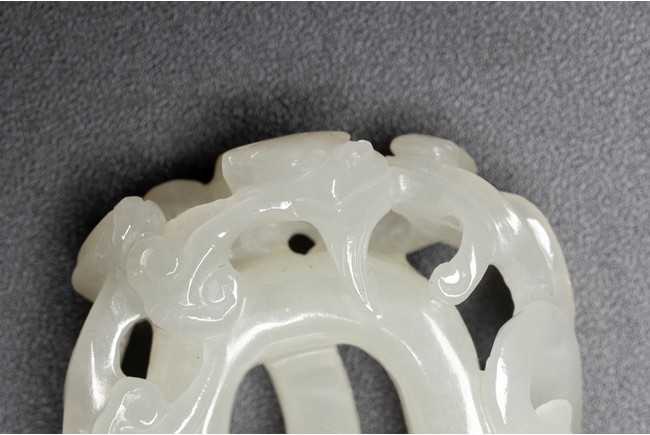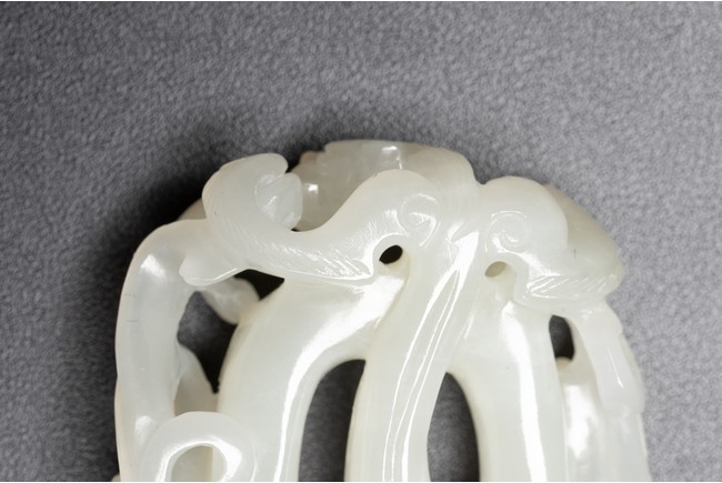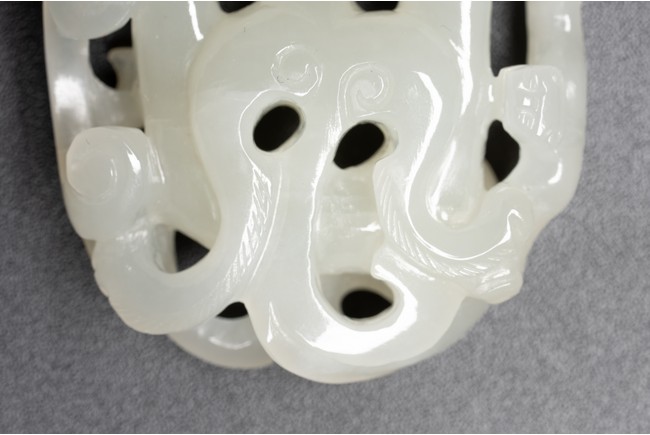 和田白玉製成,玉質潔白細膩,瑩潤光潔,光氣十足。採用浮雕,透雕,鏤雕等多種技法,雕刻“螭龍紋”,螭龍尖耳,圓眼,方鼻,闊嘴,身姿生動,穿插自如,長尾分叉上卷