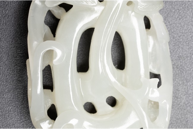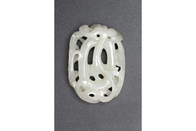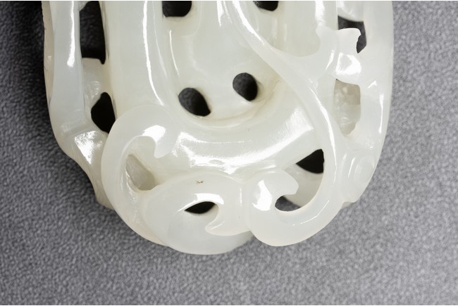 The reticulated pendant carved in the form of sinuous chilong grabbing a lingzhi branch. Qing Dynasty period.