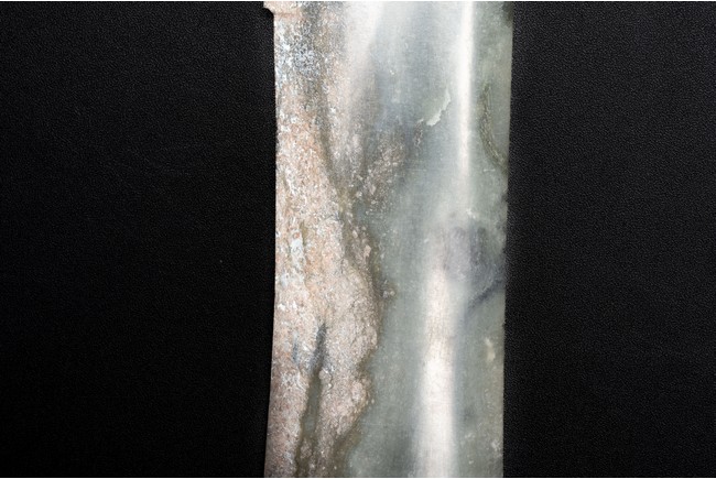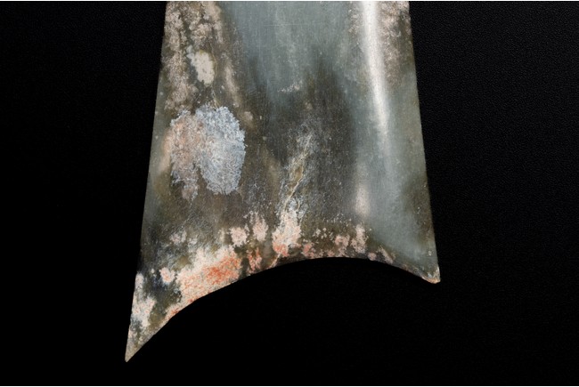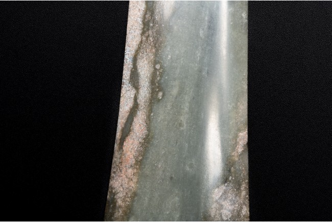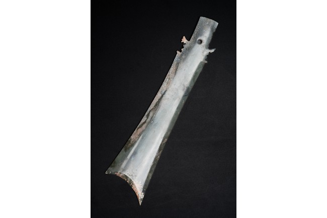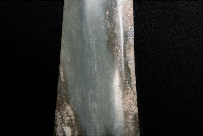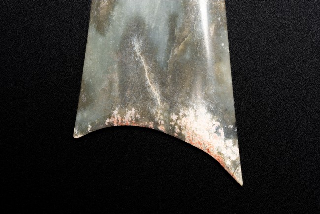 The thickly cut blade of gently waisted outline tapering from the two projecting flanges towards the curved end, the tang with a hole drilled from one side, the opaque stone smoothly polished and with some surface calcifications. Shang Dynasty period or later.