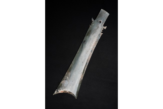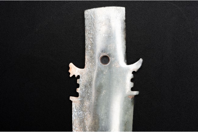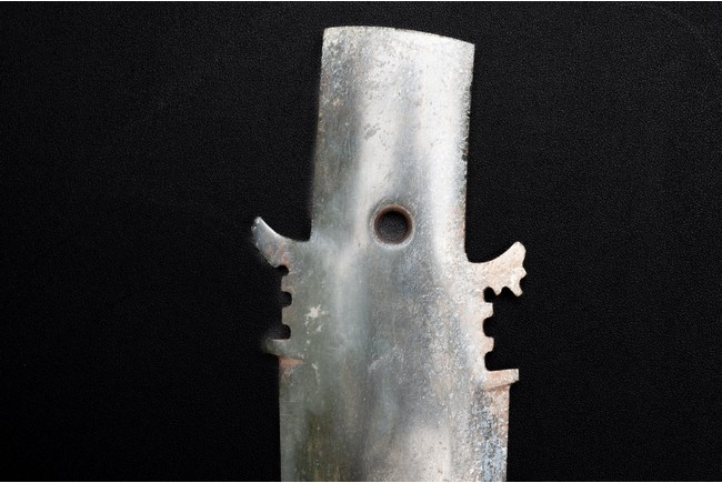 牙璋是原始社會祭祀的禮器,是以其特殊功能作用於禮制王權性質的古代中國的奴隸社會。文獻記載,「以赤璋禮南方」,還有天子巡狩時祭祀山川以及發兵所用之符,即用玉璋。本器輪廓簡約,線條優雅,琢磨細膩,且極其纖薄。雙叉,尖刃,長援,短內,一孔。青玉製成,局部帶有褐紅色沁色及灰白沁,沁色自然,玉質優良。
