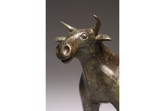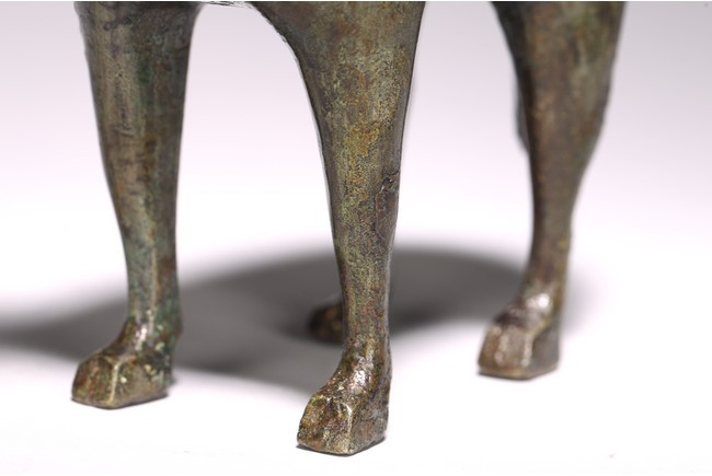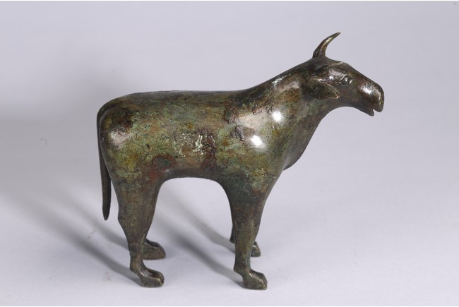 青銅制成,銅質優良,銅牛四肢直立,雙角前凸,眼珠滾圓,牛鼻向前突出,肌肉豐 滿,粗壯有力,牛尾下垂,弧度柔和優雅。整體造型穩重踏實,身形雄壯,造型比例恰當, 實屬.