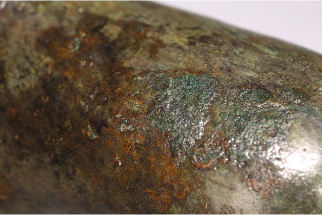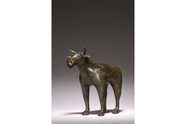 This archaic statue realistically cast in the form of standing buffalo, overall polished and with patches of green patina. Han Dynasty period.