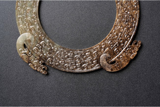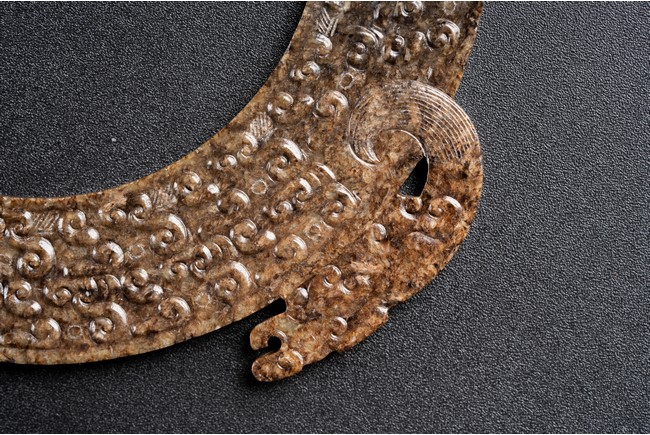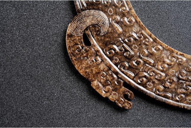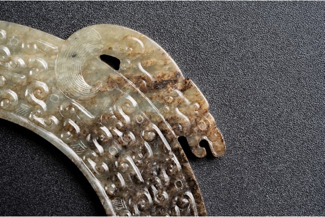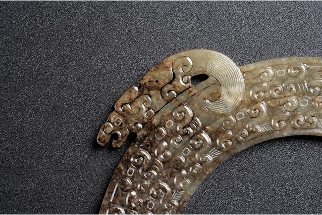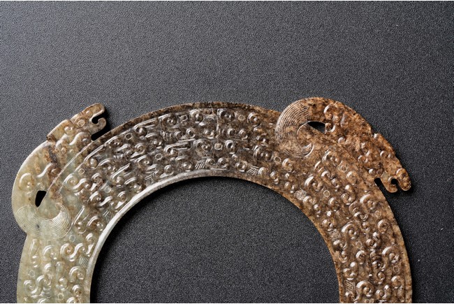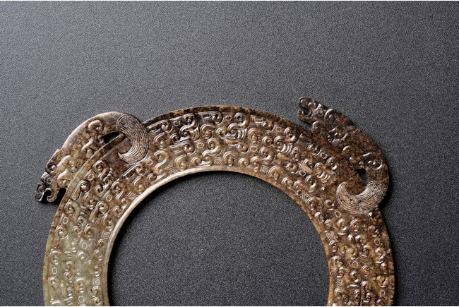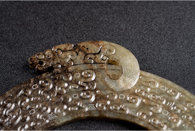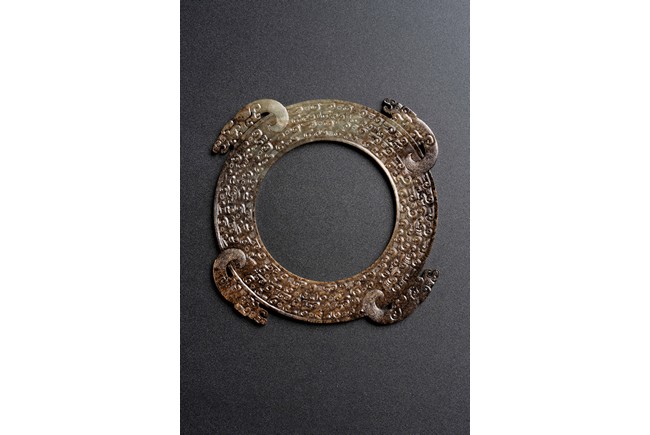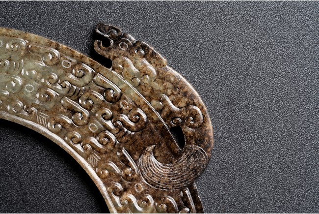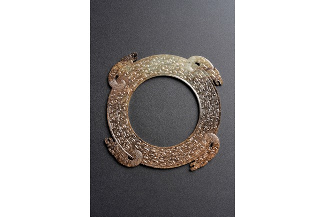 Both sides of the disc are carved in low relief with various types of scrolls and cloud motifs, further carved with four stylized mythical beasts on the outer edge. The stone is of mottled dark brown, russet, and celadon tone. Spring and Autumn period or later.