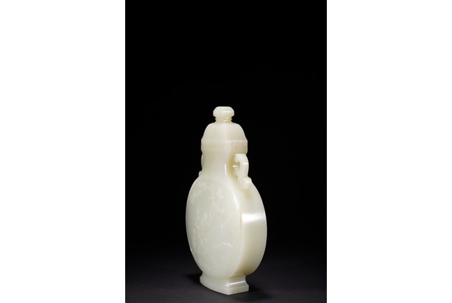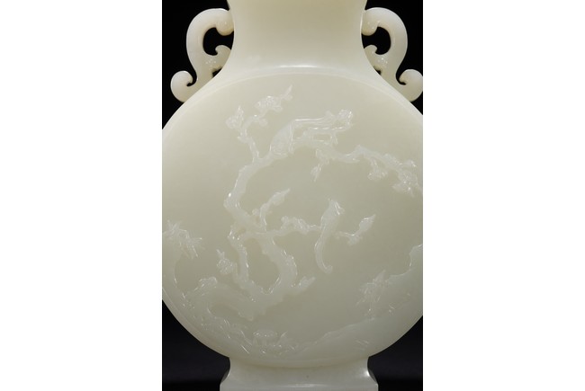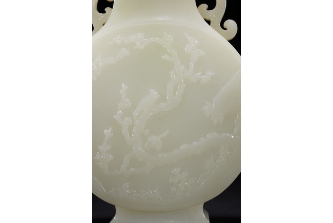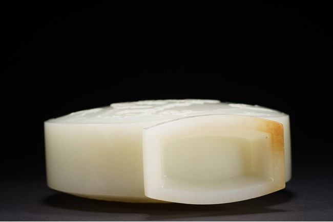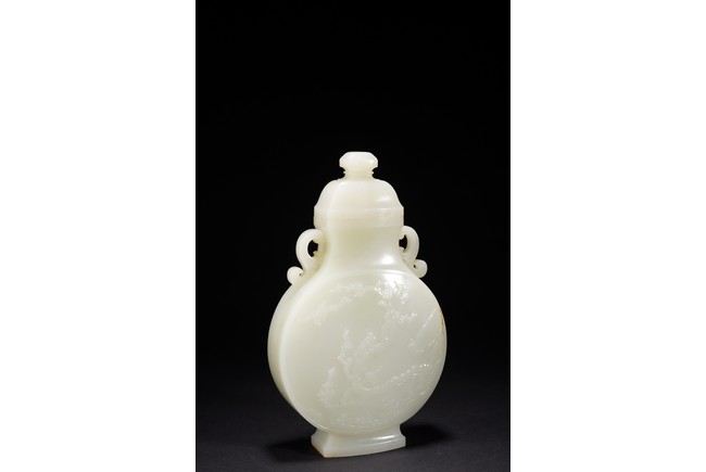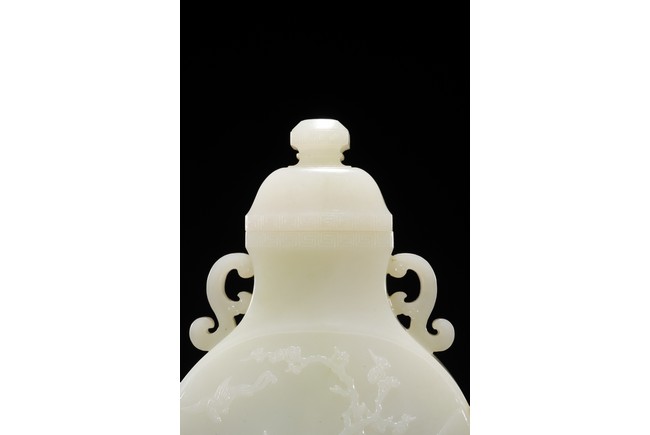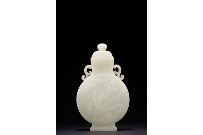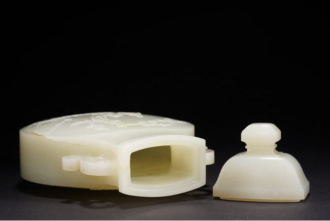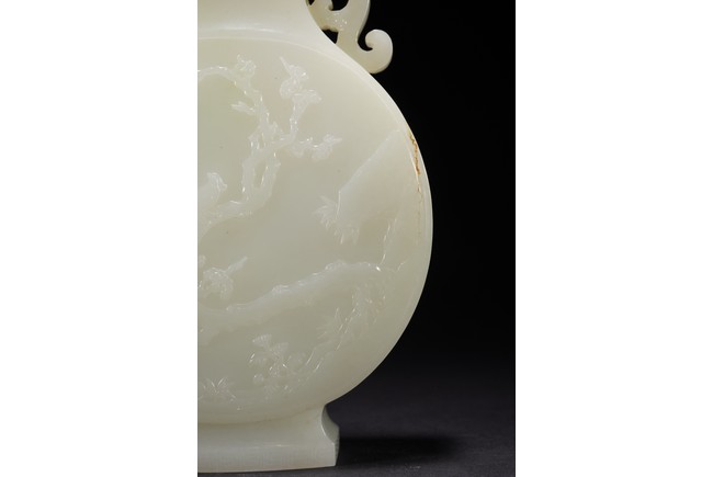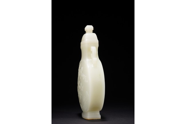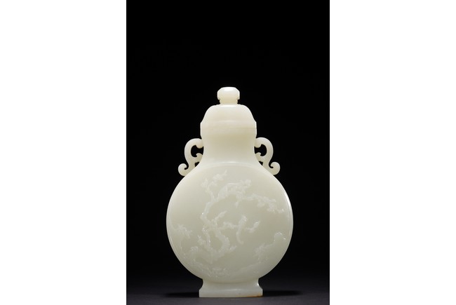 The round flattened body rising from a splayed foot, the central body carved in low-relief with to the front and reverse the scene of magpie perching on gnarled prunus branch, curved shoulders flanked by stylized s-shaped handles, the cover with canted roofed sides, all below an faceted knop, the stone of even white tone with russet area on the foot. Qing Dynasty period.