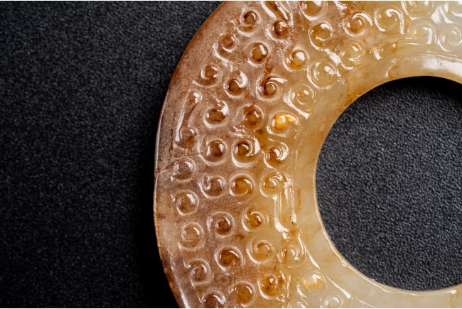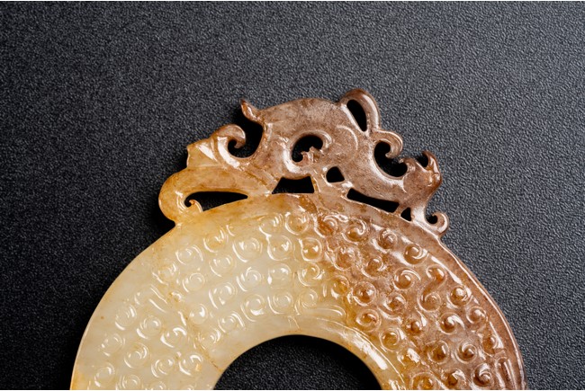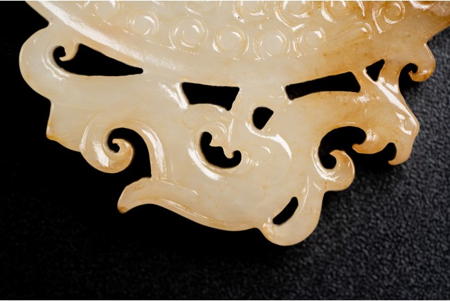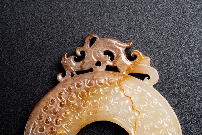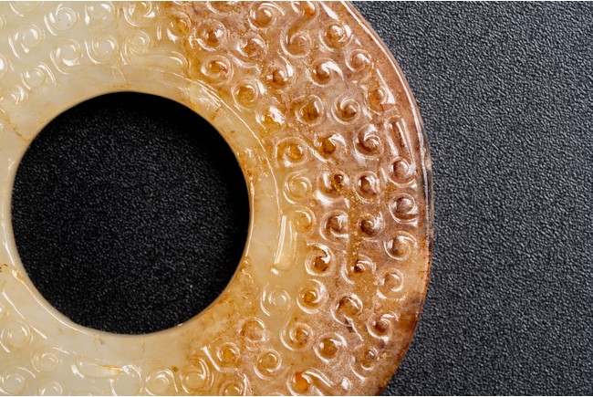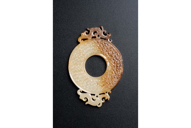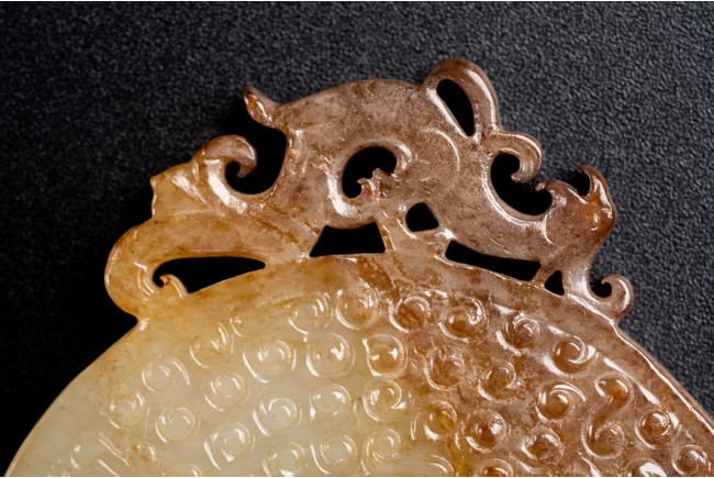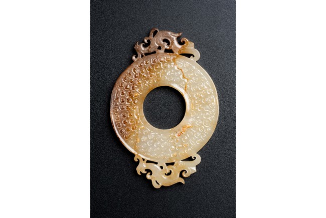 The disc is carved on both sides with comma-spiral motifs, flanked on both sides with a pair of phoenix, the stone is of white and russet tone. Western Han Dynasty or later.