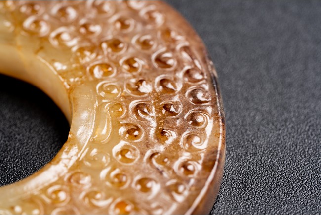 此出廓雙龍璧造型優美,璧面肉部飾浮雕谷紋,穀粒小而圓,較高凸起,上以陰線勾出渦紋,排列有序,剔地干淨利落。整器玉質上乘,氣韻靈動,巧奪天工,是持有者身份地位之象徵。