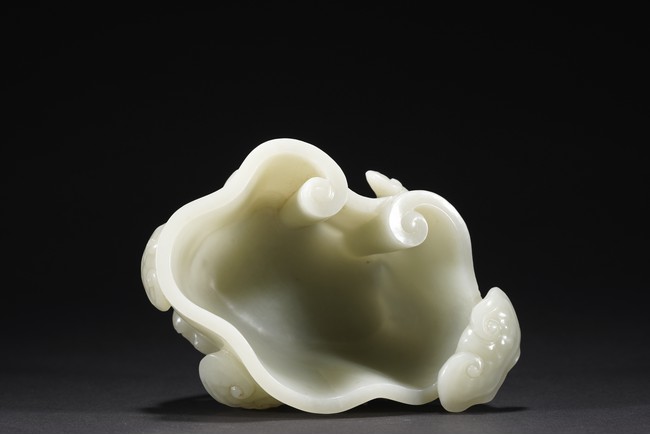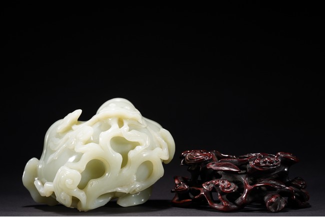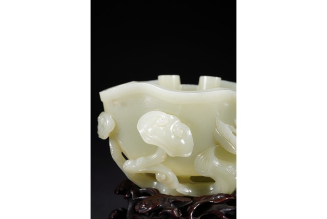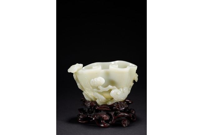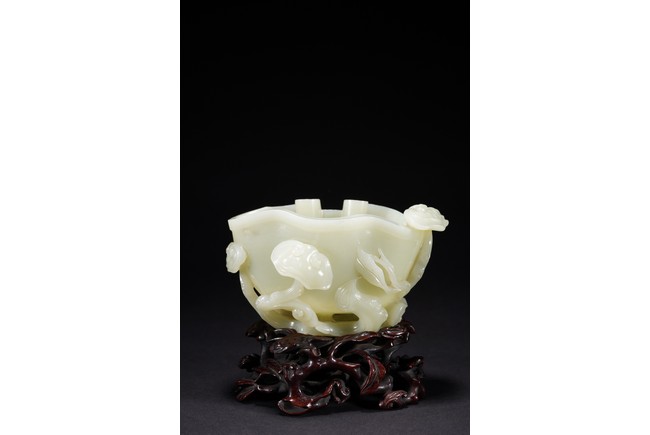 The deep hollowed vessel in the form on a large lingzhi head borne on a gnarled branch and surrounded by smaller lingzhi heads, the stone of an attractive white tone with minor inclusions, hardwood stand. Qing Dynasty period.
