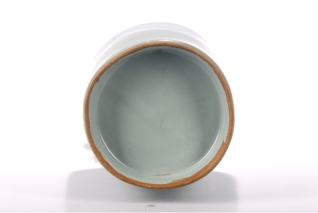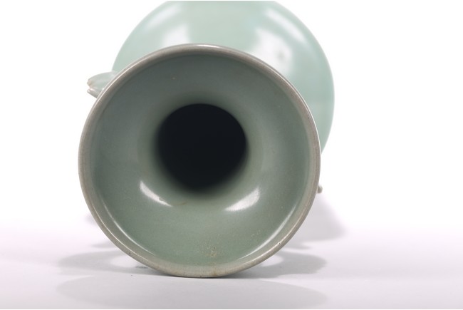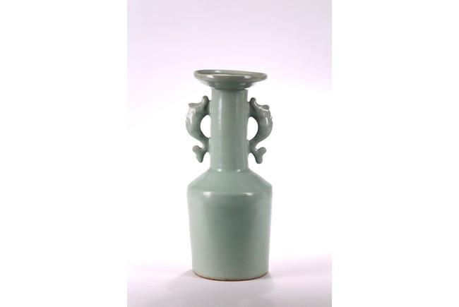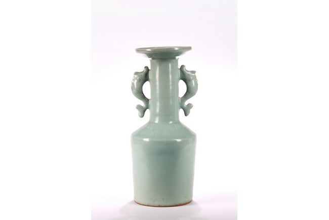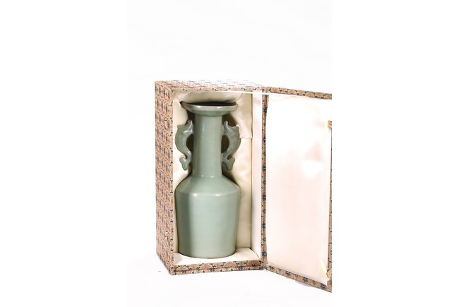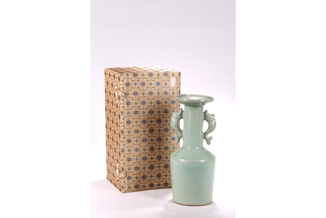 The tapering cylindrical body surmounted by a tall columnar neck and flanked by a pair of serpentine dragon-fish, covered overall in a sea-green glaze, with box. Song Dynasty period.