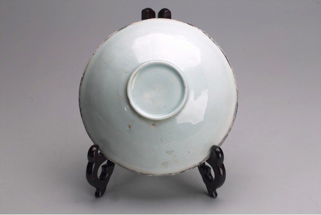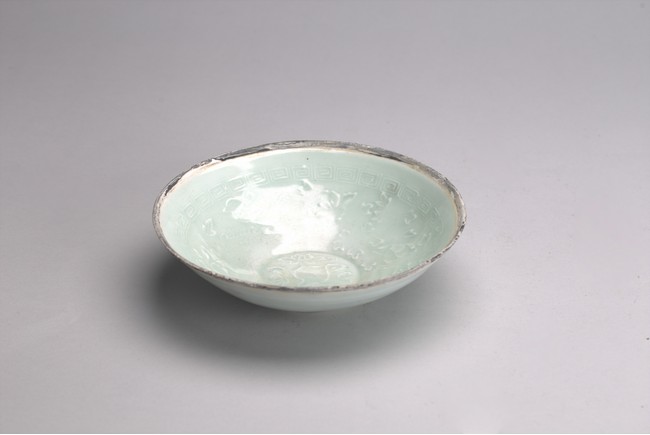 Finely potted with steep sides rising from a short straight foot, molded to the interior with a center of two lotus flowers and leaf, encircled with mandarin ducks and phoenix amidst lotus peonies, covered overall in a pale blue glaze save for the exposed rim. Song Dynasty period.