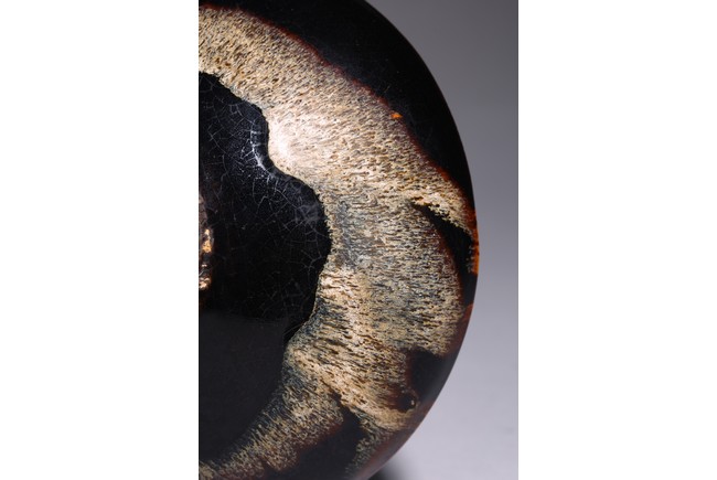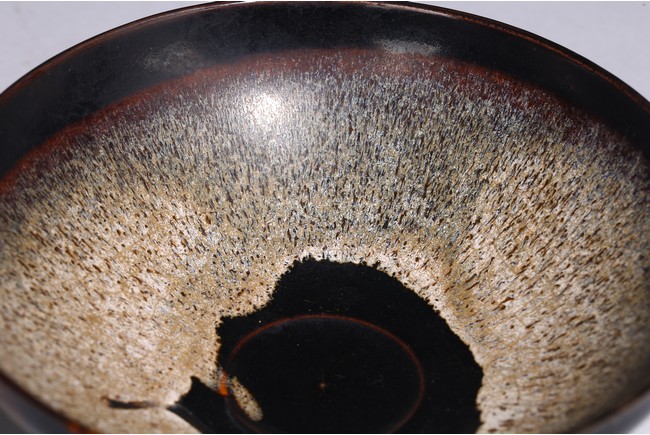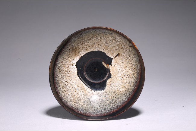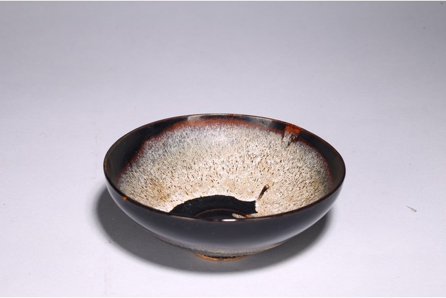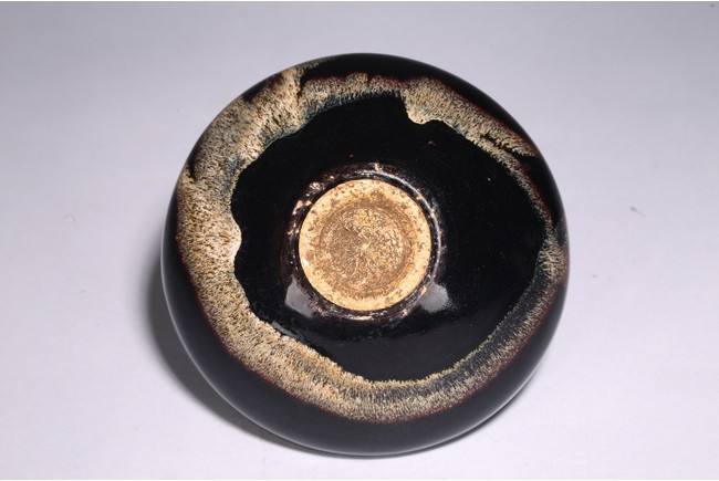 The bowl interior covered with splash of purplish cream glaze around the black glazed center, the exterior covered with black glaze and freely decorated with splash of cream colored glaze, the foot unglazed. Song Dynasty period.