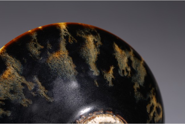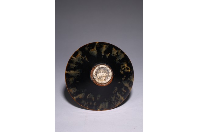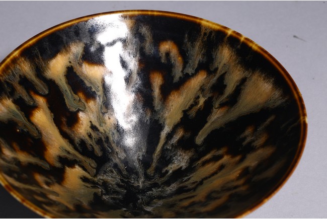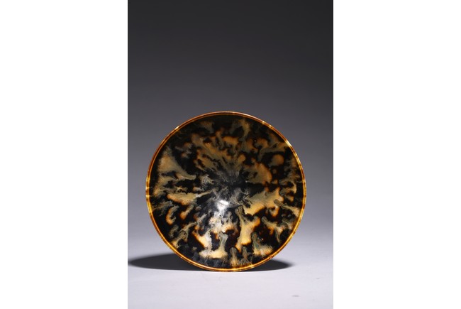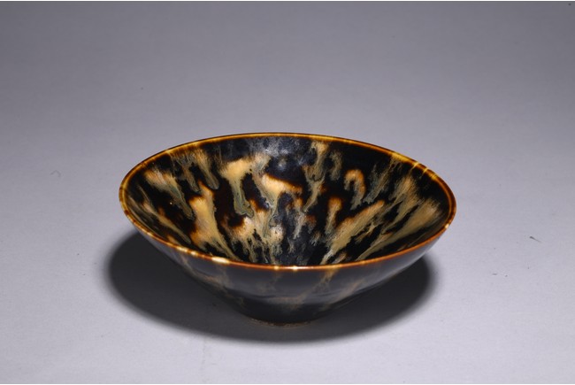 The interior and exterior decorated with a rich dark brown glaze liberally splashed in translucent golden glaze in imitation of mottled tortoiseshell, base unglazed. Song Dynasty period.