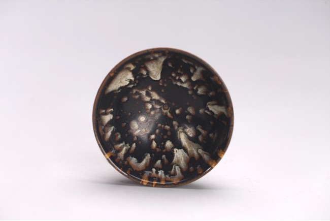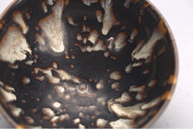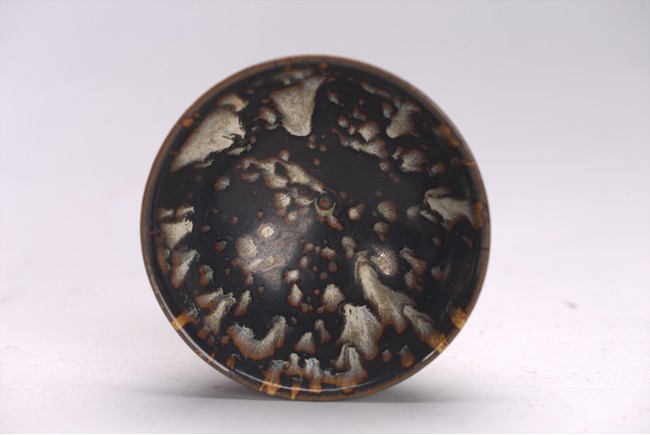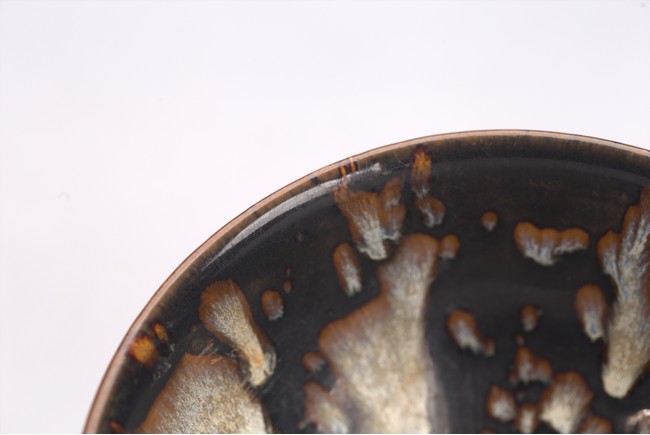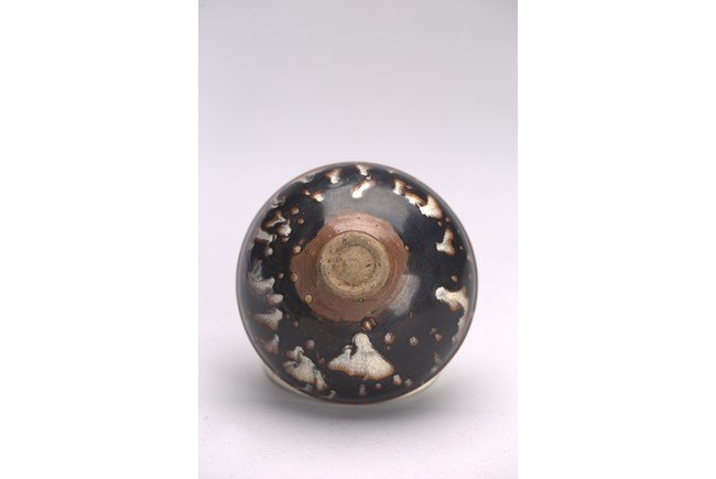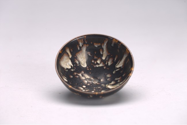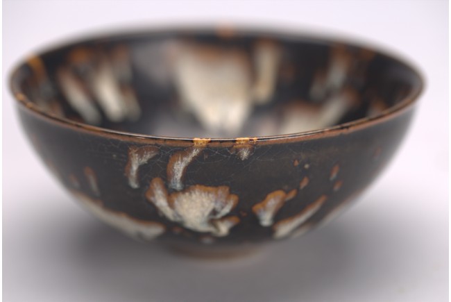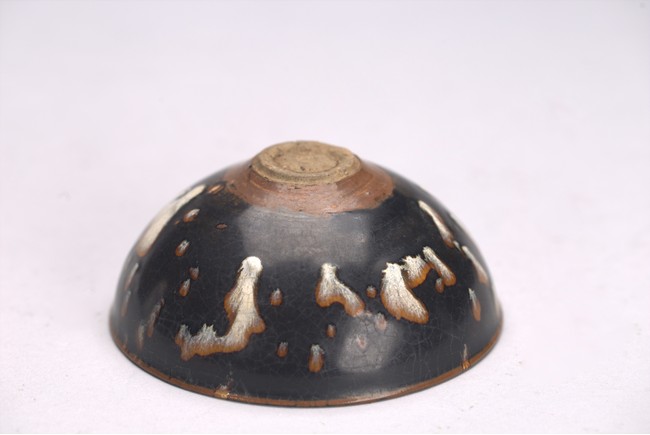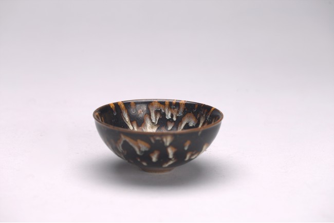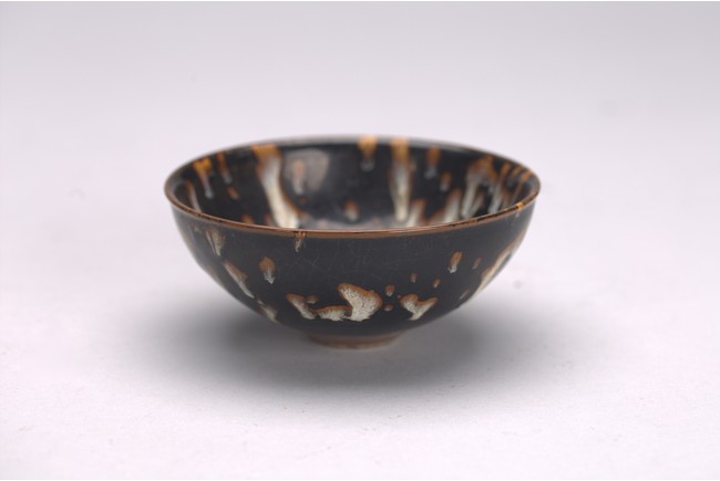 With the deep rounded sides flaring from a narrow flat foot, covered overall with a brownish-black glaze and splashed with cream-caramel tones simulating tortoiseshell, the glaze finishing just above the knife-pared foot, the base unglazed revealing the buff body. Song Dynasty period.