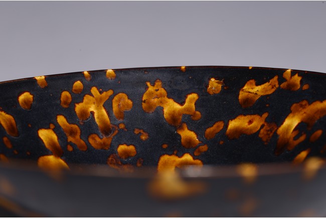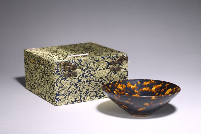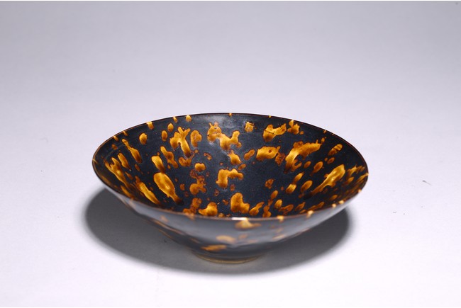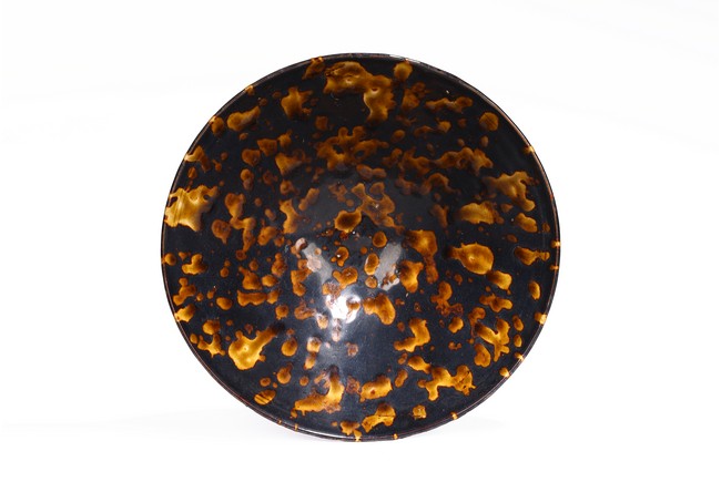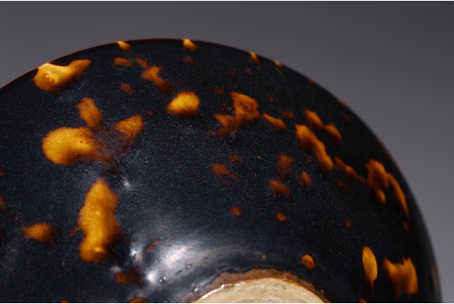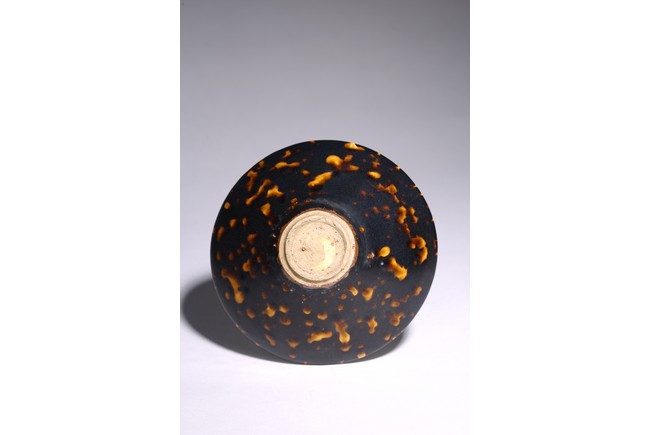 Covered inside and out with a rich dark brown glaze and liberally splashed in orange brown tones in imitation of tortoiseshell, the glaze stopping short of the knife-pared foot. Song Dynasty period.