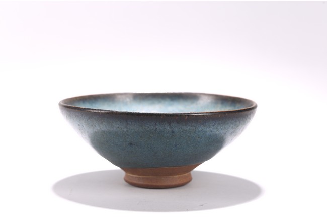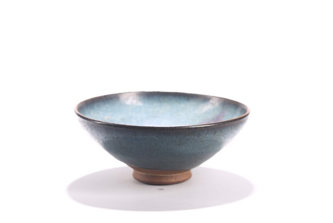 The thickly potted body with rounded sided rising from a short tapering foot, the body covered in a thick lustrous sky-blue glaze thinning to mushroom tones at the mouth rim and irregularly stopping just above the foot, with a purple splash to the interior. Yuan/Ming Dynasty period.