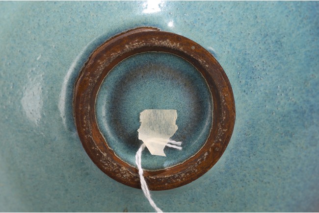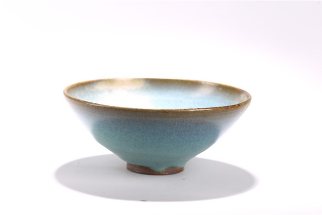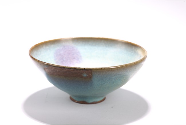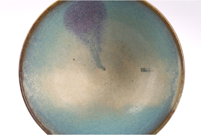 With rounded sides and a short straight foot, covered inside and out with a thick glaze of pale milky blue tone, with an irregularly-shaped splash of purple swirl at the interior. Yuan/Ming Dynasty period.