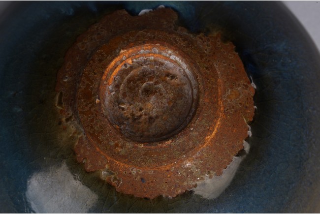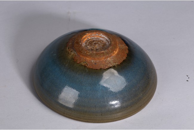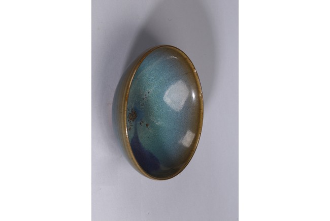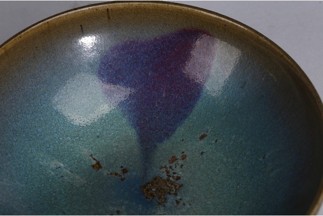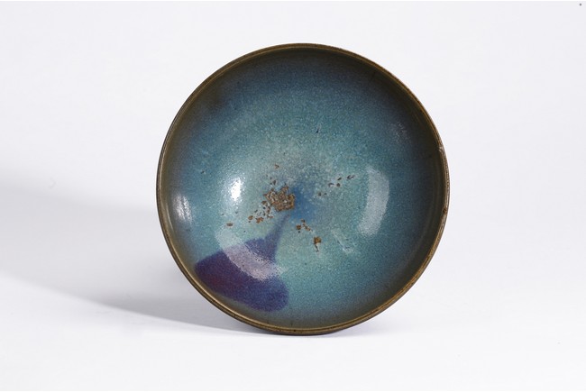 The thickly potted body with rounded sided rising from a short tapering foot, the body covered in a thick lustrous sky-blue glaze thinning to mushroom tones at the mouth rim and irregularly stopping just above the foot, with a purple splash to the interior. Yuan/Ming Dynasty period.