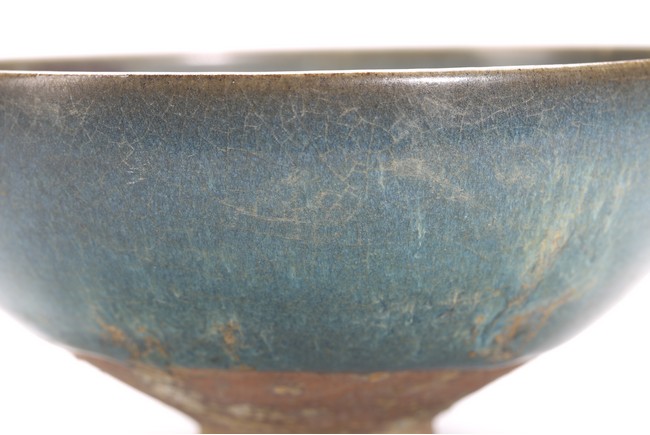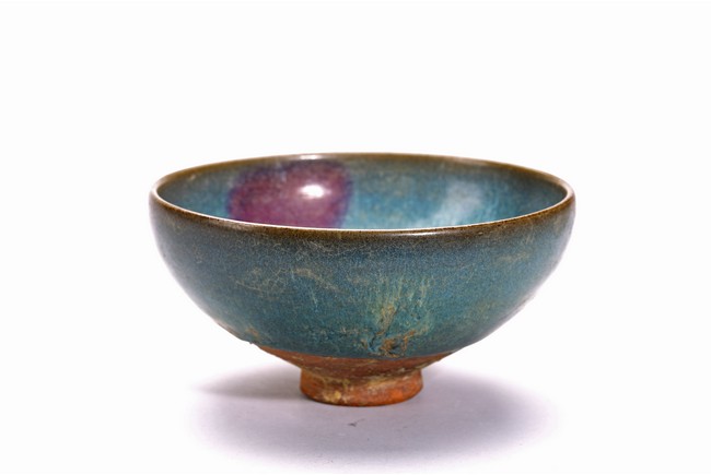 With rounded sides and a short straight foot, covered inside and out with a thick glaze of pale milky blue tone, with an irregularly-shaped splash of purple swirl at the interior. Yuan/Ming Dynasty period.