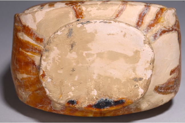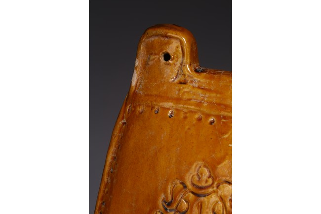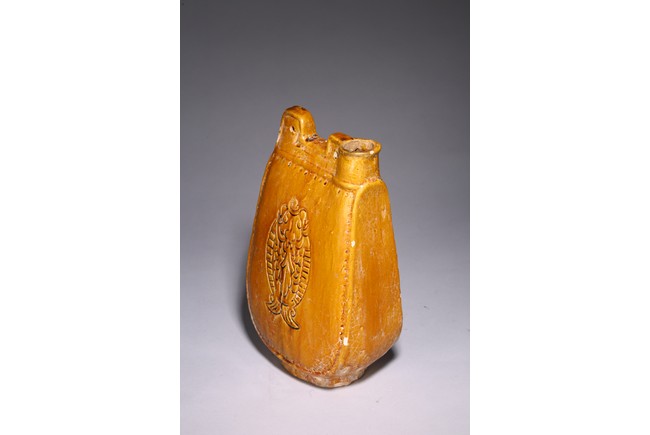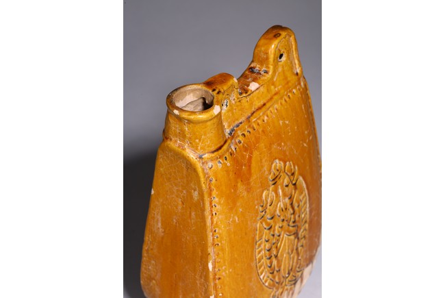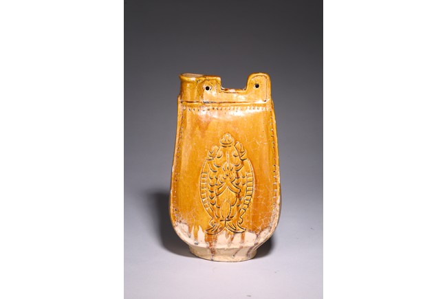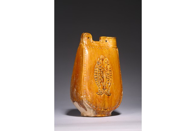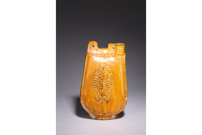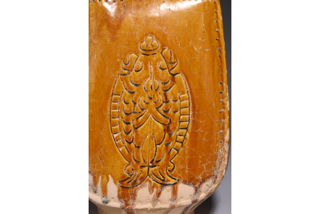 Modeled after a leather prototype, the body moulded and incised with a double fish motif, all under a rich amber glaze stopping around the base to reveal the pale slip and buff pinkish clay. Liao Dynasty period.
