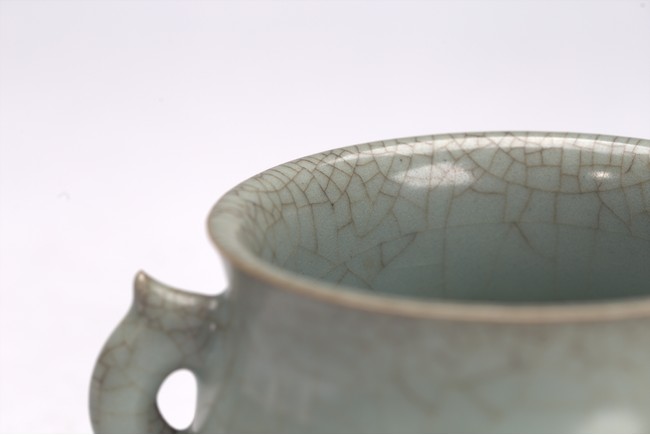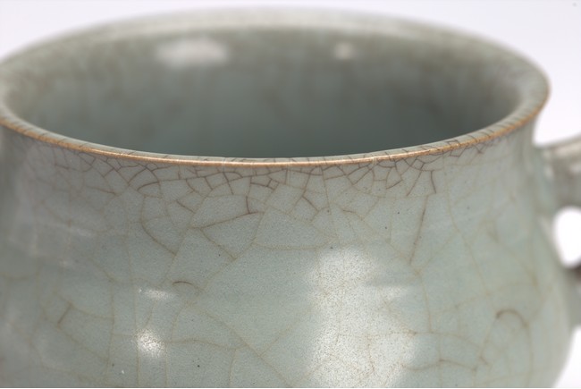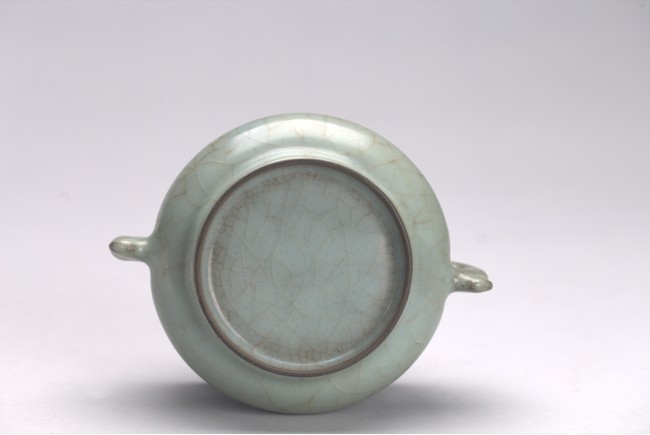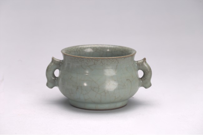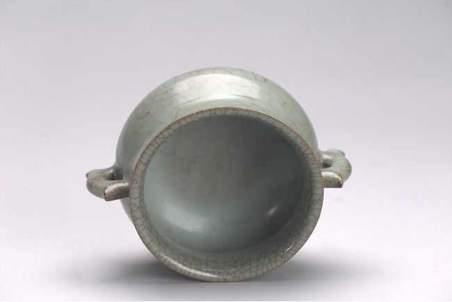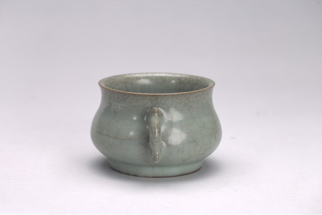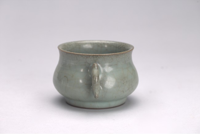 The censer is potted with a compressed globular body, flared rim, and is flanked by a pair of inverted dragon handles. The vessel is covered all overin a greyish blue-green glaze suffused with dark and light brown crackle. Yuan/Ming Dynasty period.