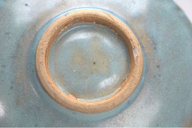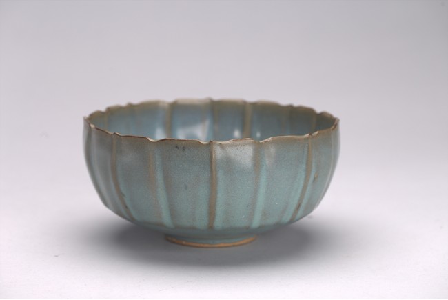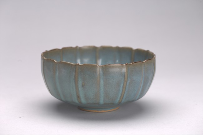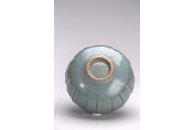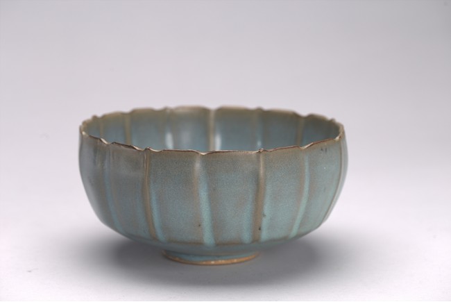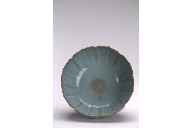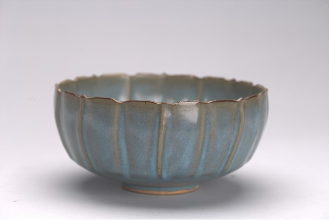 The deep, rounded sides are molded as eight petals that rise from the small ring foot to the barbed rim, and are covered inside and out with purplish-blue color.