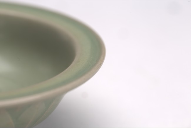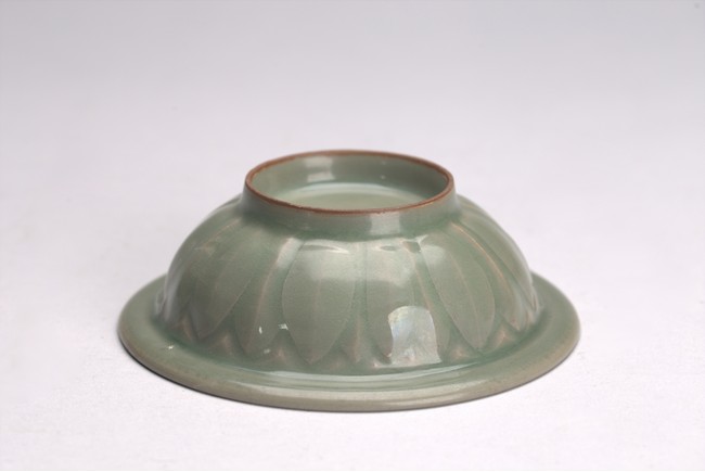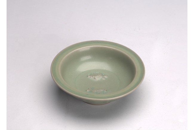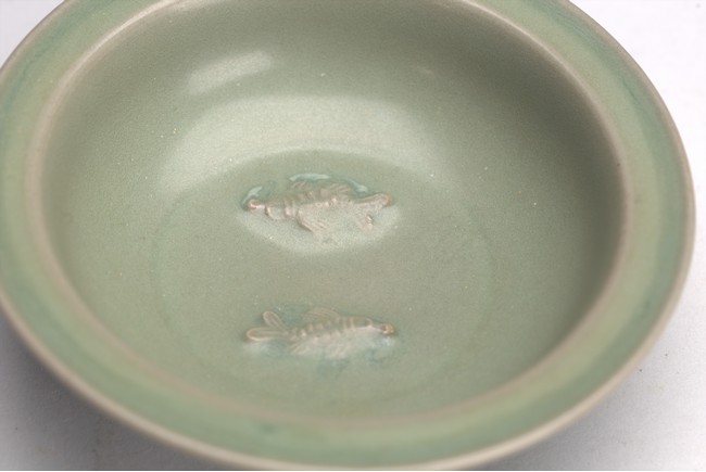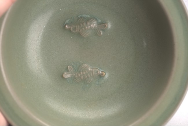 The center of the interior moulded with two fish, the exterior with petal ribs, all under olive green glaze thinning at the rims and stopping neatly around the foot. Ming Dynasty period.