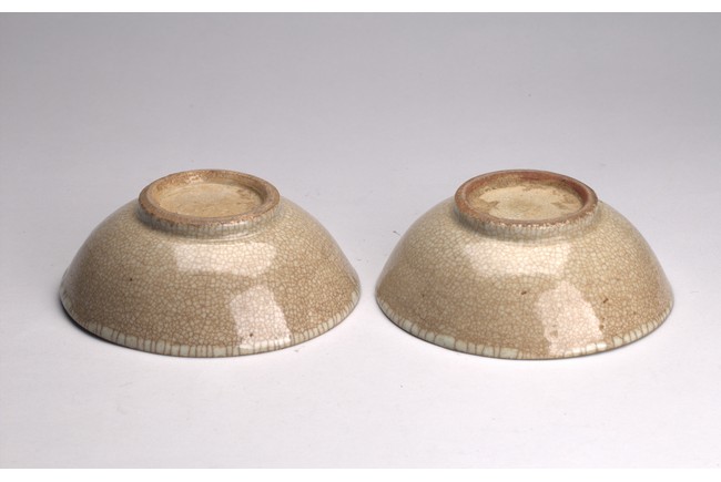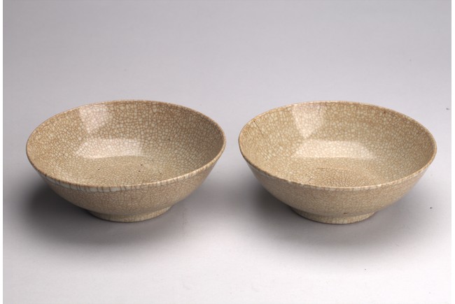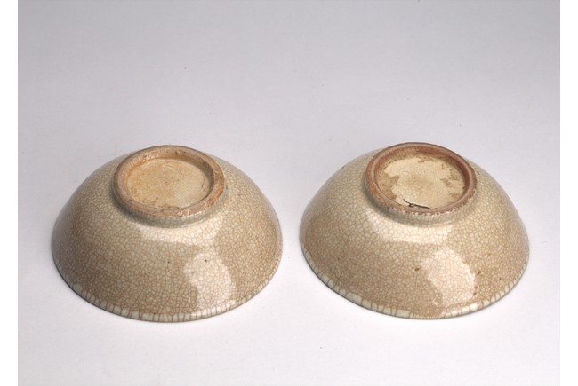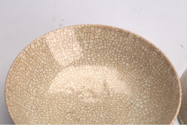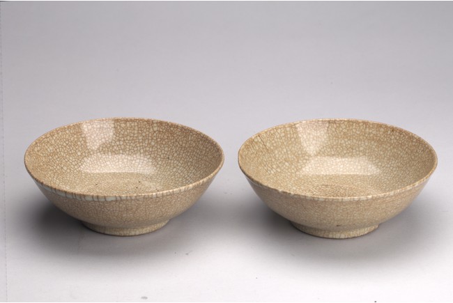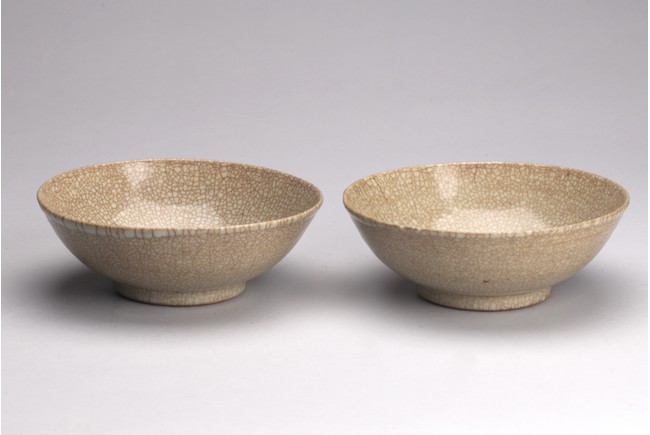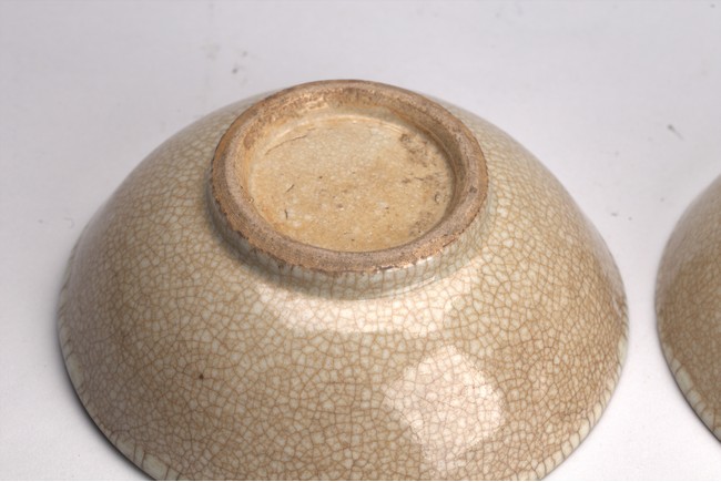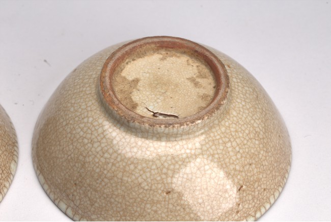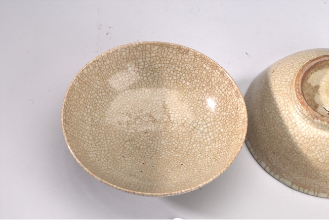 The bowl of deep rounded rising to a slightly flared rim covered inside and out with an attractive greyish glaze suffused with crackle joined by faint gold tone crackle. The foot rimressed in a dark brown wash. Ming or Qing Dynasty period.