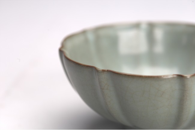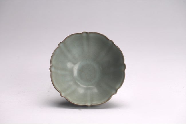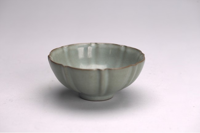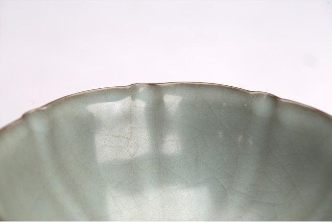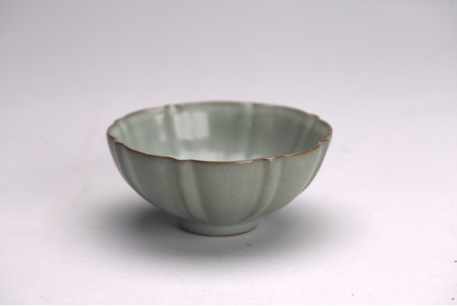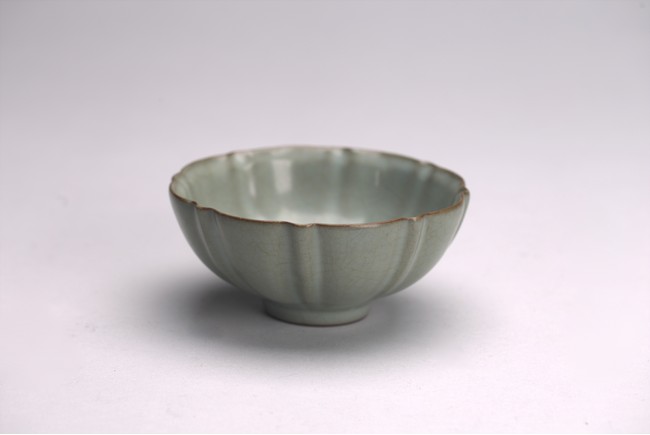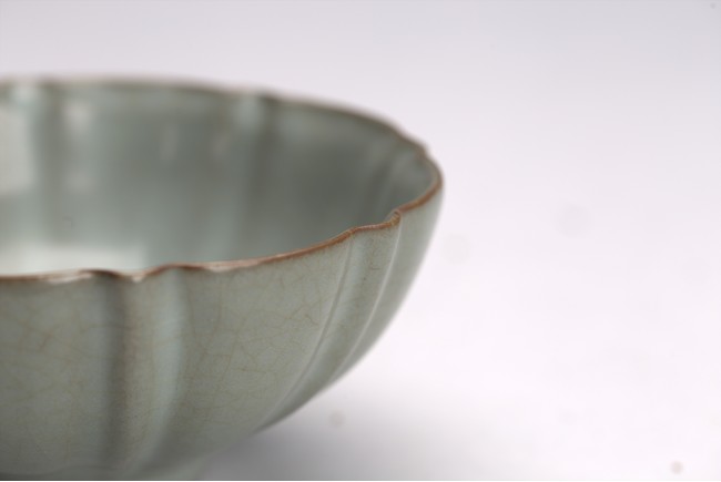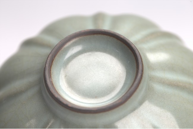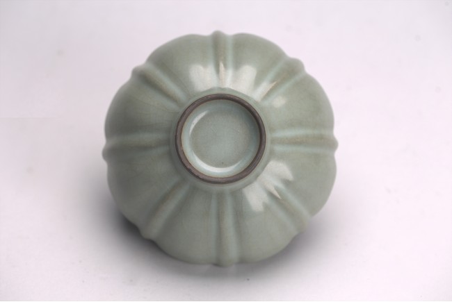 With the fluted sides rising from a straight foot, covered overall with a greyish-green glaze, the top rim and foot ring dressed in brown. Yuan/Ming Dynasty period.
