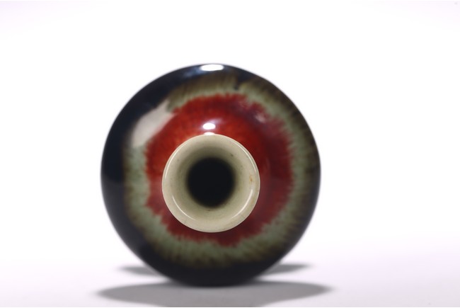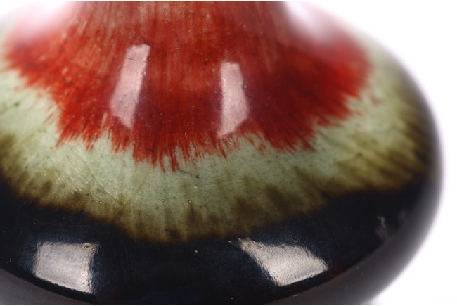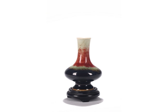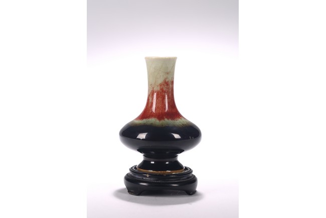 Covered overall with a vibrant mixed glaze of cream, red, green, and dark blue glaze, wood stand. Qing Dynasty period.