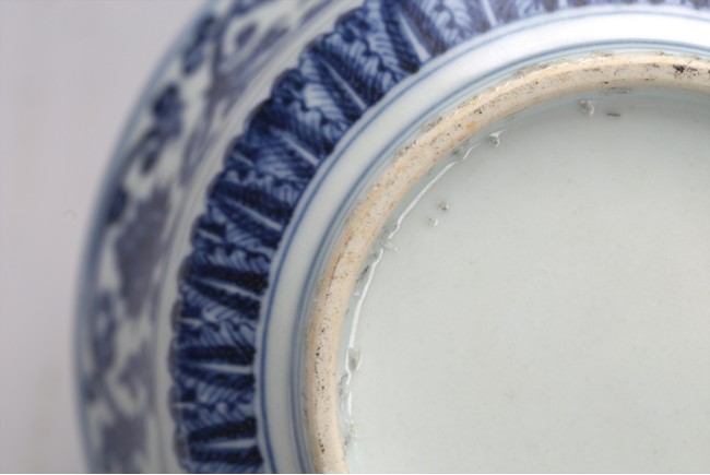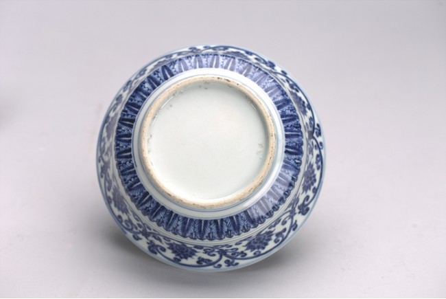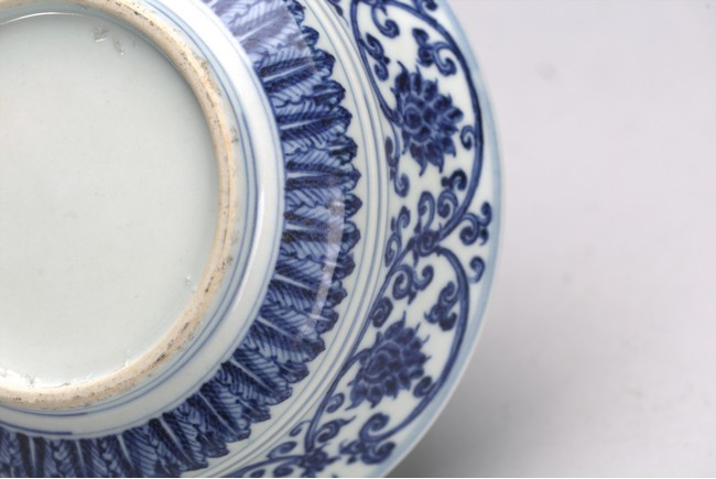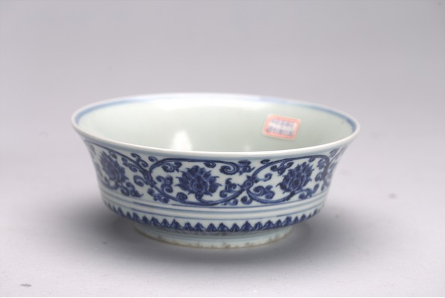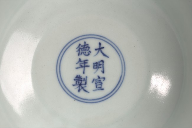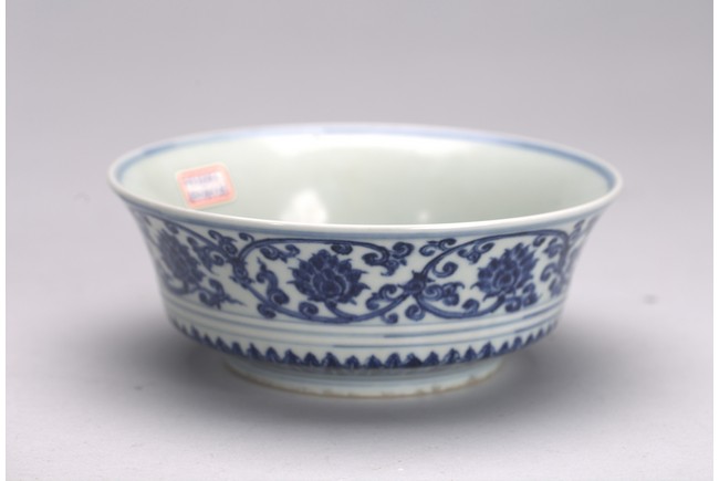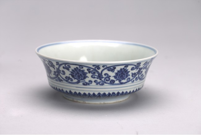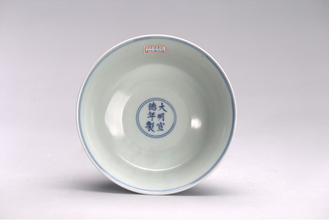 The bowl exterior with stylized lotus flower scrolls above three concentric lines and lappets, the interior inscribed with six character Xuande mark.