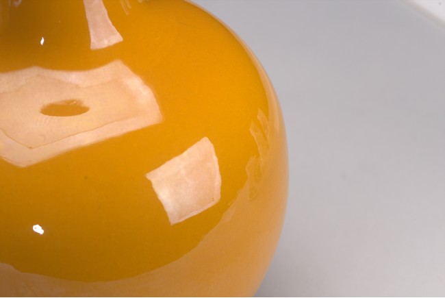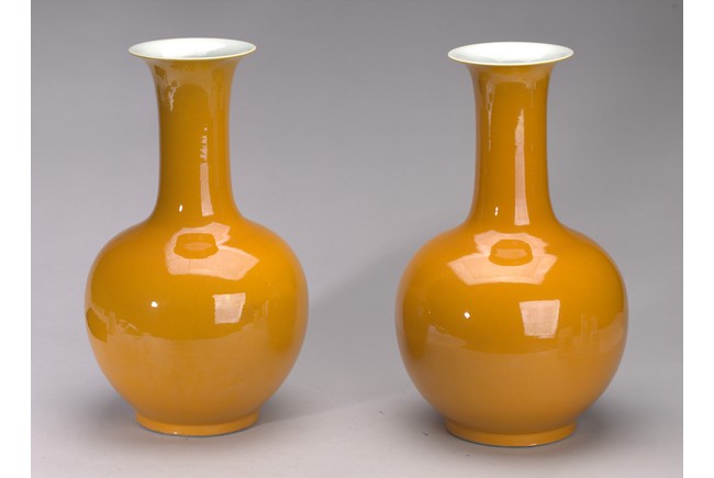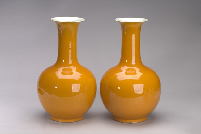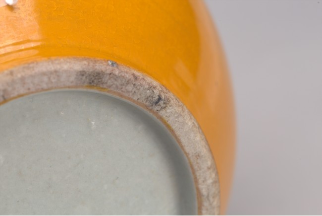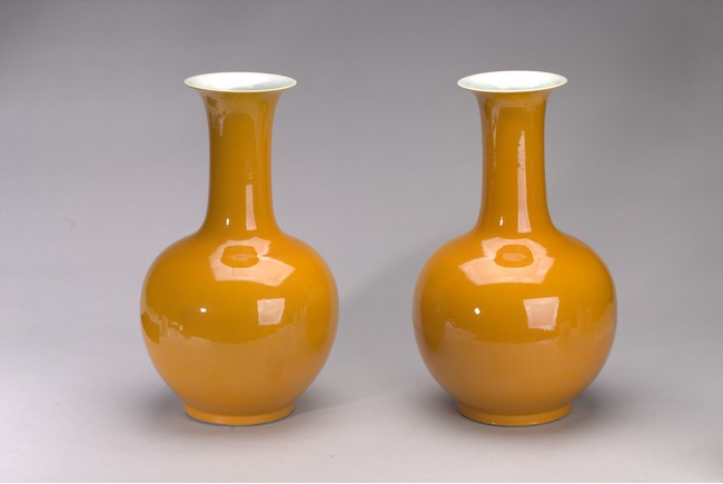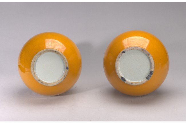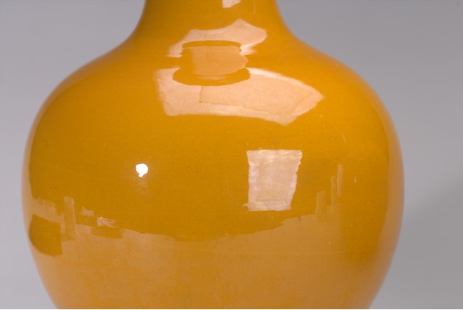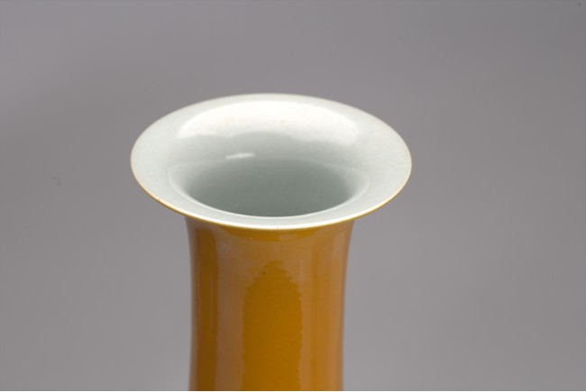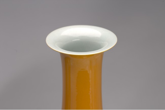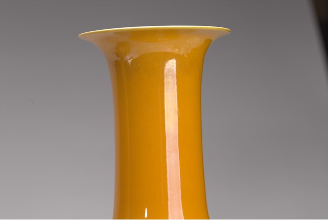 The ovoid body supported on a slightly spreading foot and rising to a slender waisted neck and flared rim, covered overall in a deep yellow glaze, the base glazed in white. Qing Dynasty period.