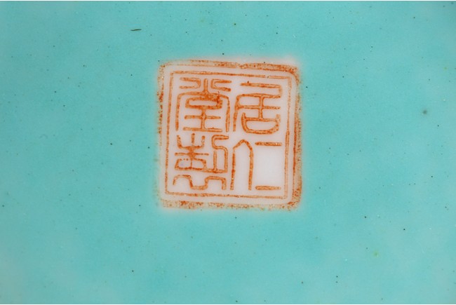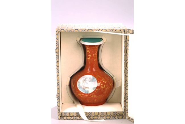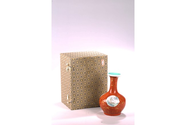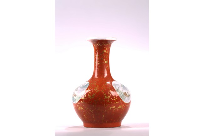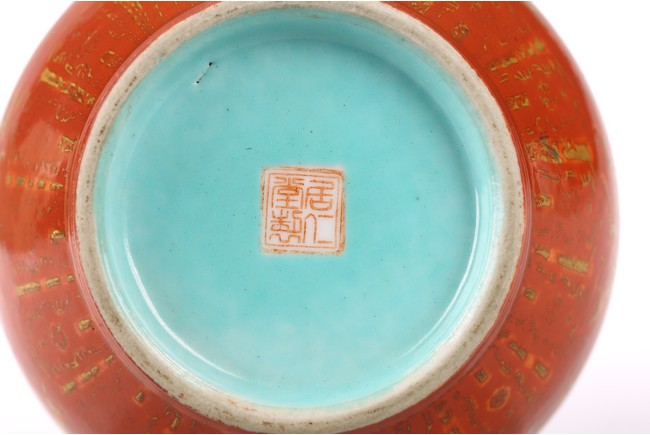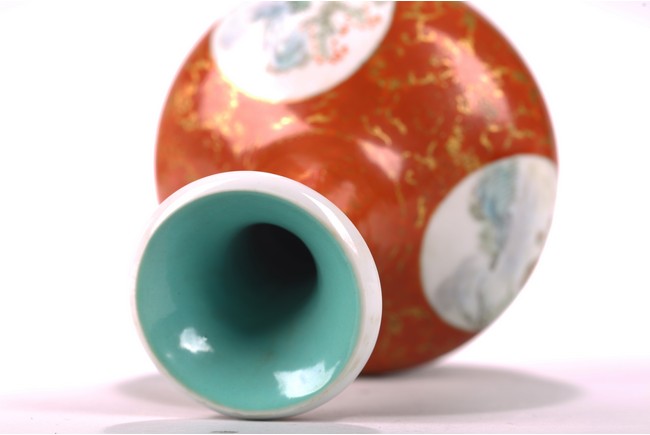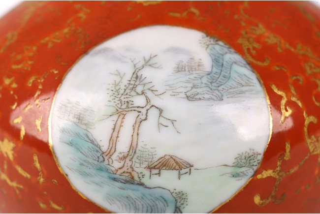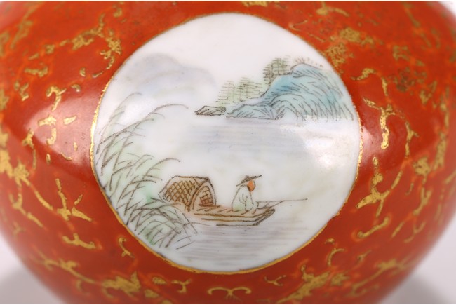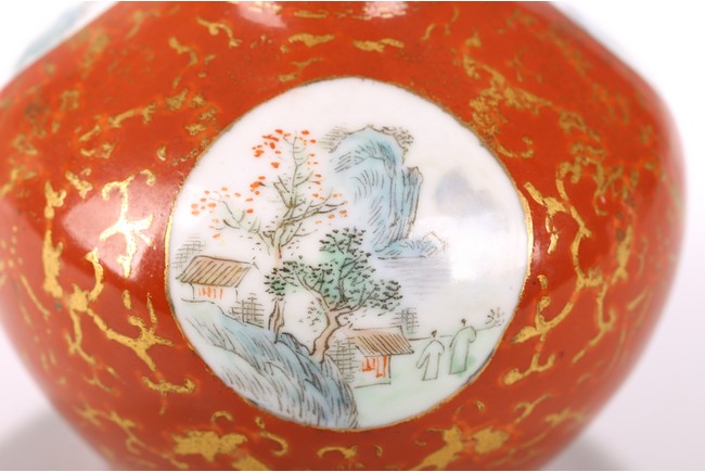 The rounded body rising to straight neck and flared mouth, decorated with three roundels enclosing landscape in famille rose, all reserved on coral red ground with gilt decorative patterns, base inscribed with four character mark. Circa 1915-1916.