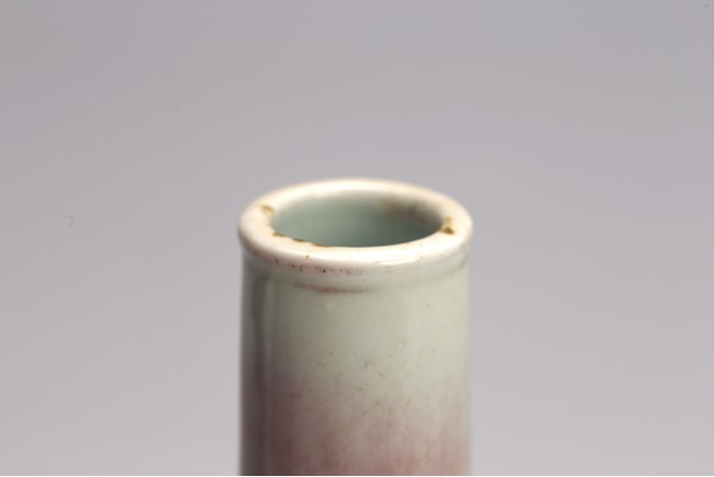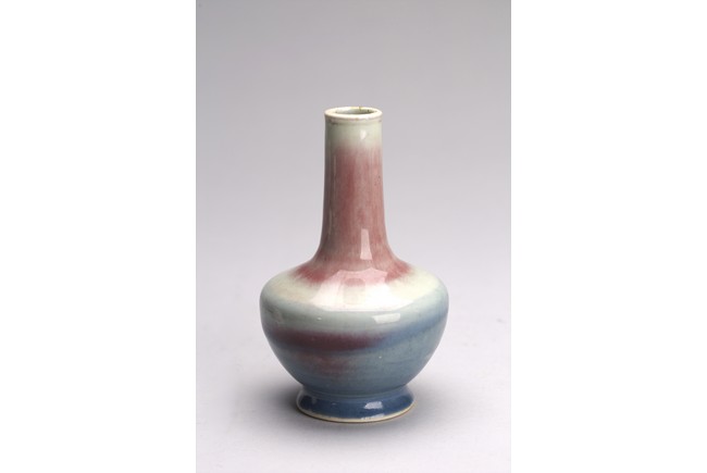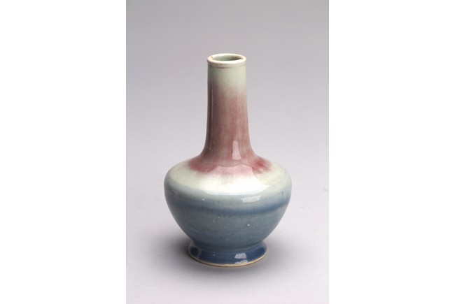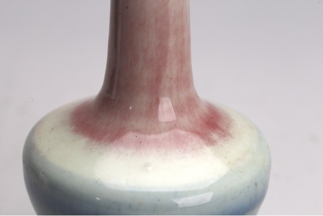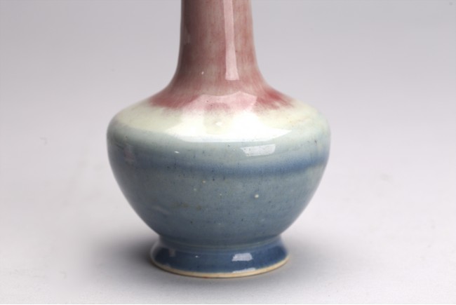 The vase decorated with peachbloom red glaze around the neck and blue and red glaze around the body. Qing Dynasty period.