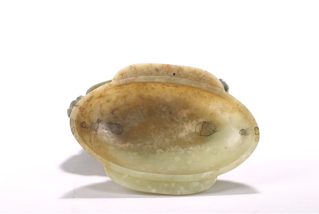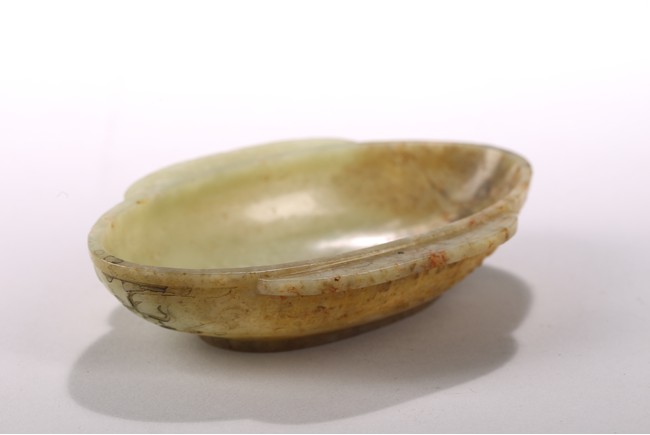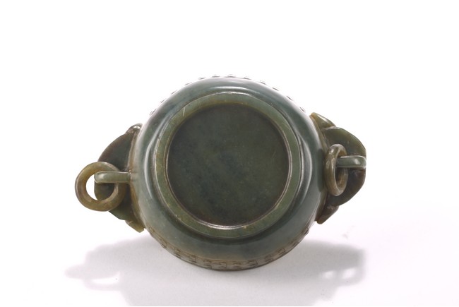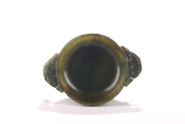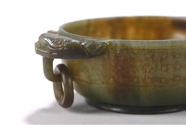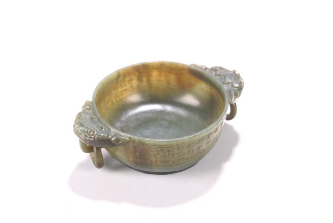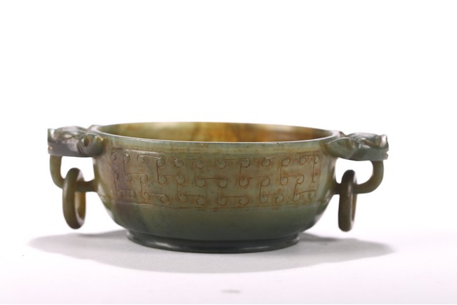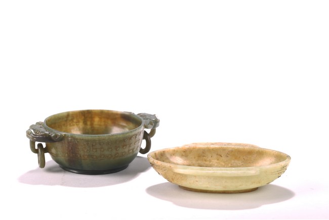Consisted of a green jade washer flanked by pair of handles suspended with loose rings; and a celadon jade archaistic boat-shaped vessel. Qing Dynasty period.