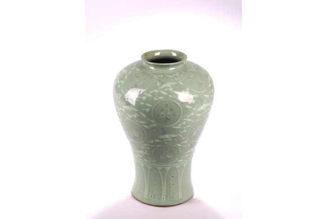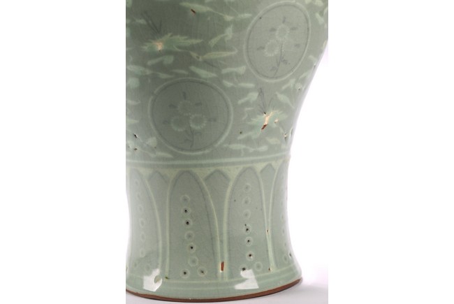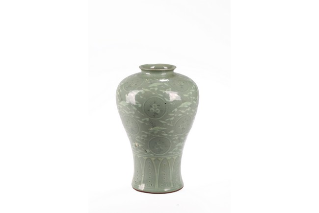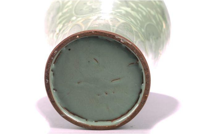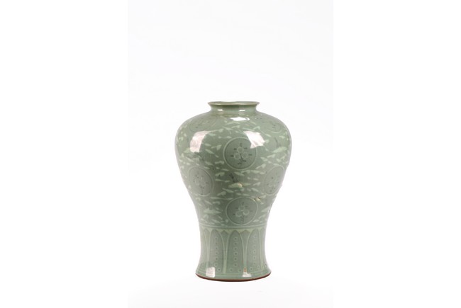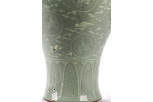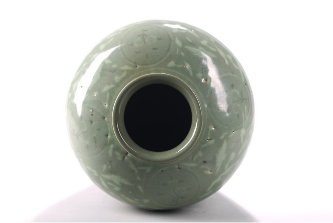 The waisted lower body rising to a broad shoulder surmounted by a small neck and cupped rim, the sides carved with roundels inclosing chrysanthemum spray and cranes and clouds in the spaces between the roundels, covered overall in a translucent olive-colored glaze.