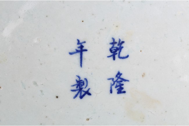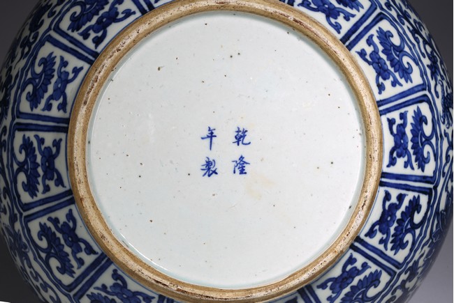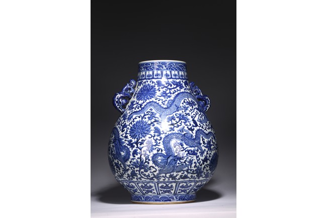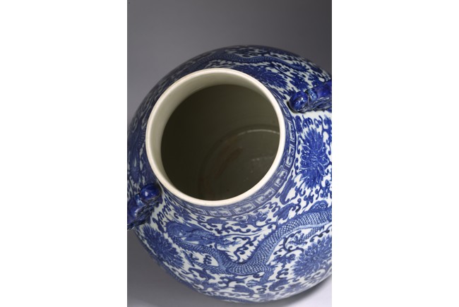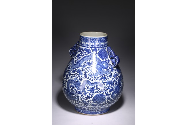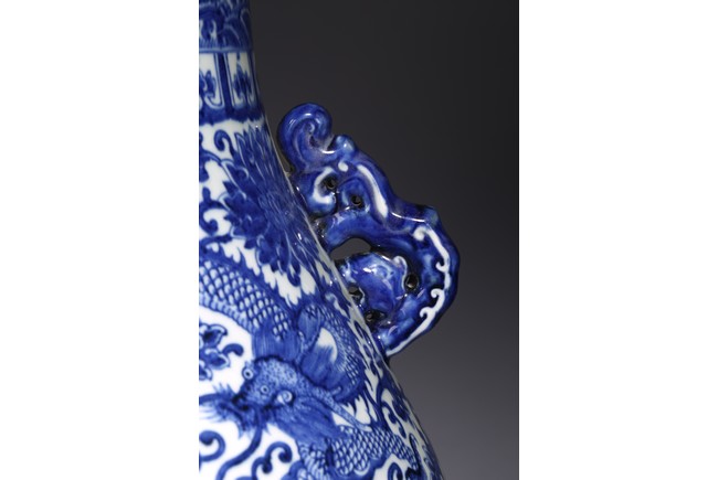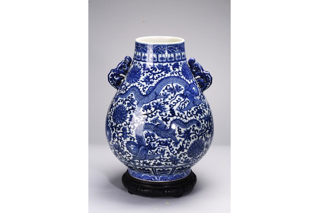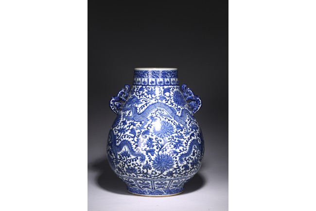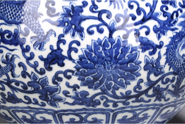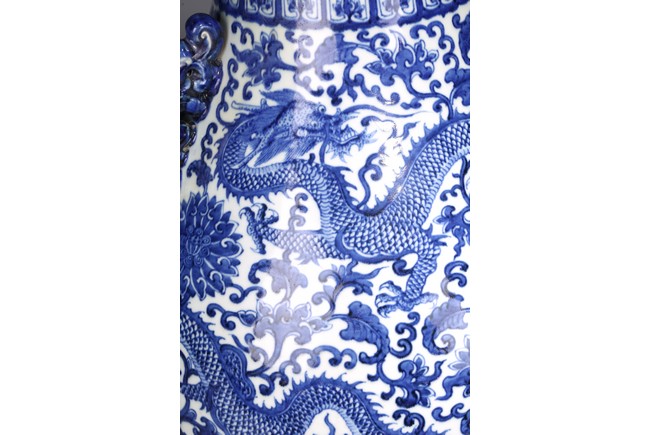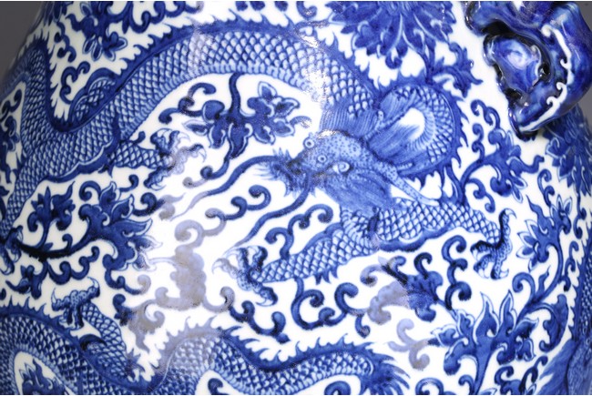 The pear-shaped body rising from a short spreading foot to a short waisted flaring neck flanked by chilong handles, painted around the exterior in rich cobalt-blue tones with a sinuous five clawed ferocious dragons amidst lotus scrolls, all between ruyi, lotus-lappet bands, and borders of waves at the rim and the base, with four character reign mark at the base. Qing Dynasty period.