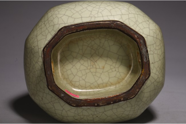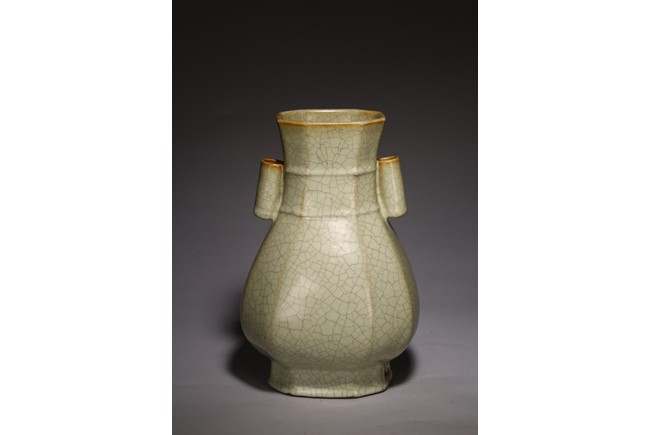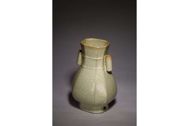 The vase is made in imitation of Song dynasty Ge ware with a faceted body, a pair of lug handles, and is covered overall with a glaze of pale bluish-grey color suffused with dark grey crackle, the unglazed bottom of the foot is covered with a brown dressing. Qing Dynasty period.