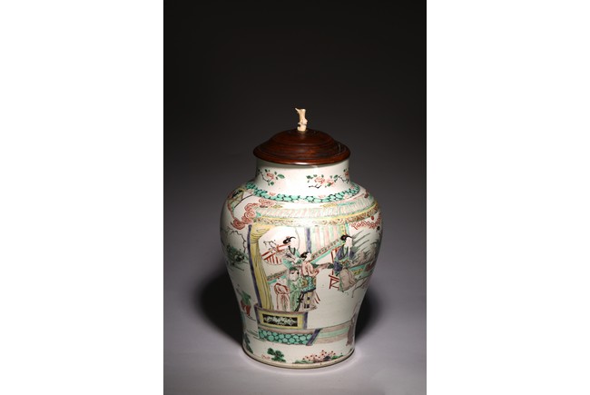 Stoutly potted in baluster form, painted around the exterior with a continuous garden scene of depicting boys playing in an outdoor setting; scholars appreciating scenery in a pavilion; and beautiful maidens engaged in leisurely pursuits, all below a band at the collar and flower sprays at the neck. Qing Dynasty period.
