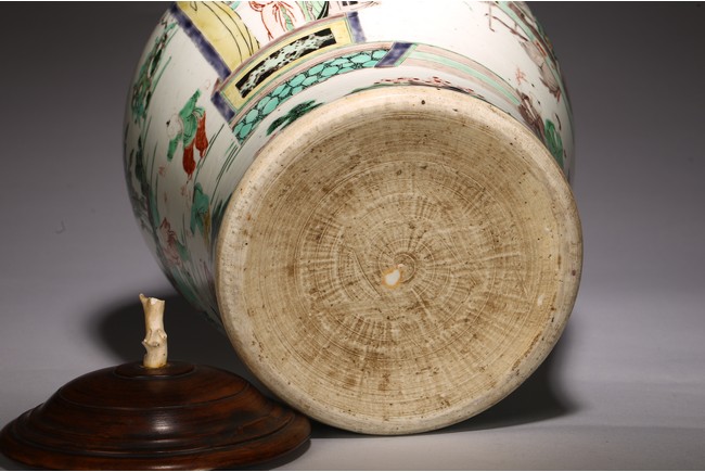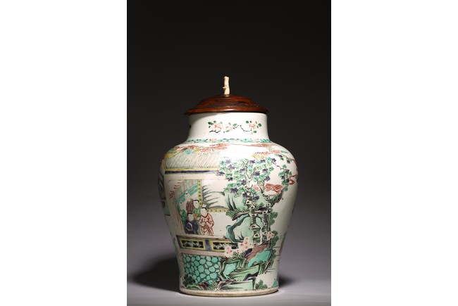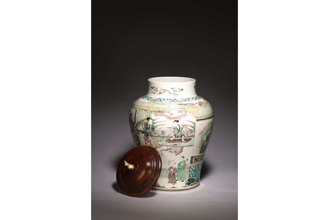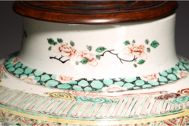 圓口,直頸,鼓腹下收,圈足,帶紅木蓋。施五彩,以紅、綠、黃、黑、赭等多色搭