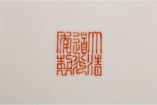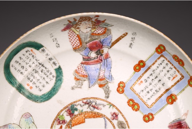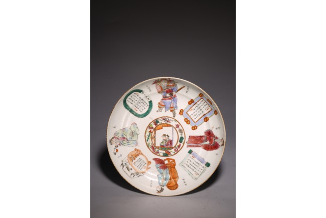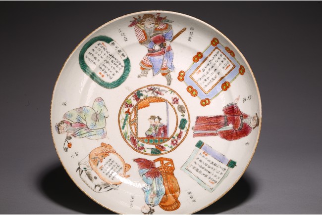 圓口,折腰,圈足。器身施粉彩繪人物,人物神態各異,神情生動,衣紋自然清晰。用墨 彩書寫詩文,筆法老道,蒼穹有力